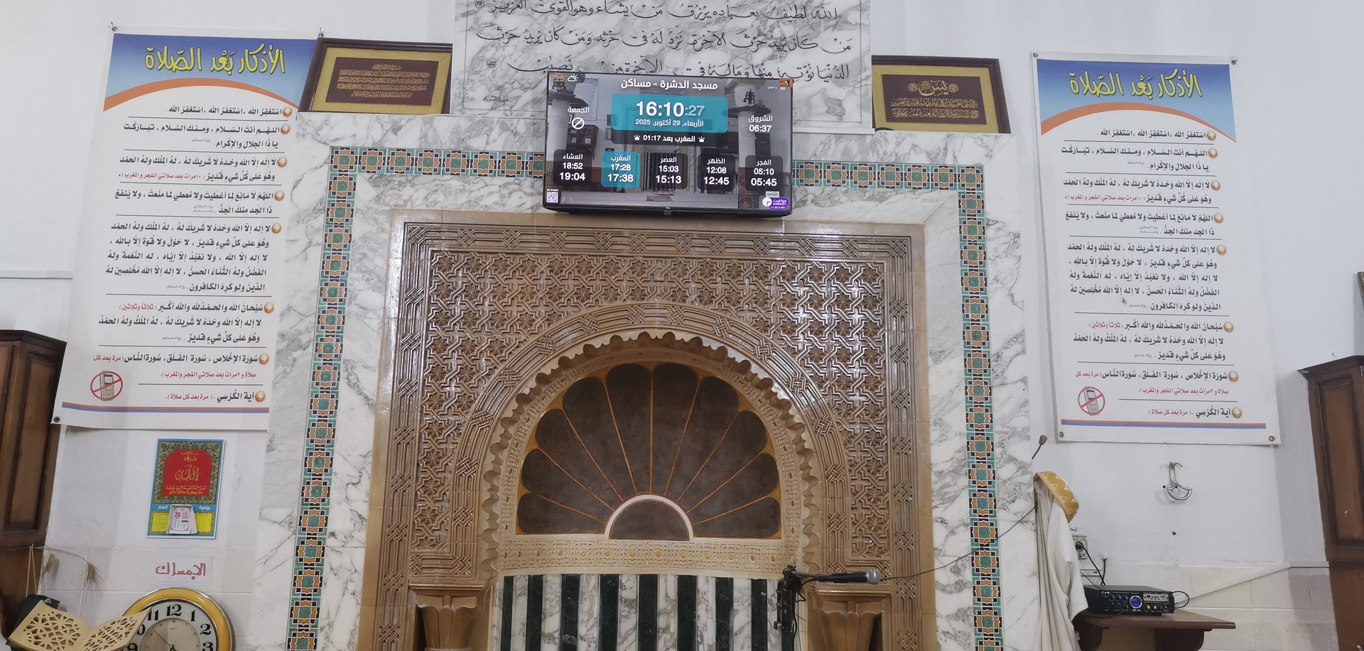 بين الأذان والإقامة ، وبعد كل صلاة ، يتم عرض الأذكار والأدعية. كما يعرض حديث للنبي "صلى الله عليه وسلم" كل 5 دقائق