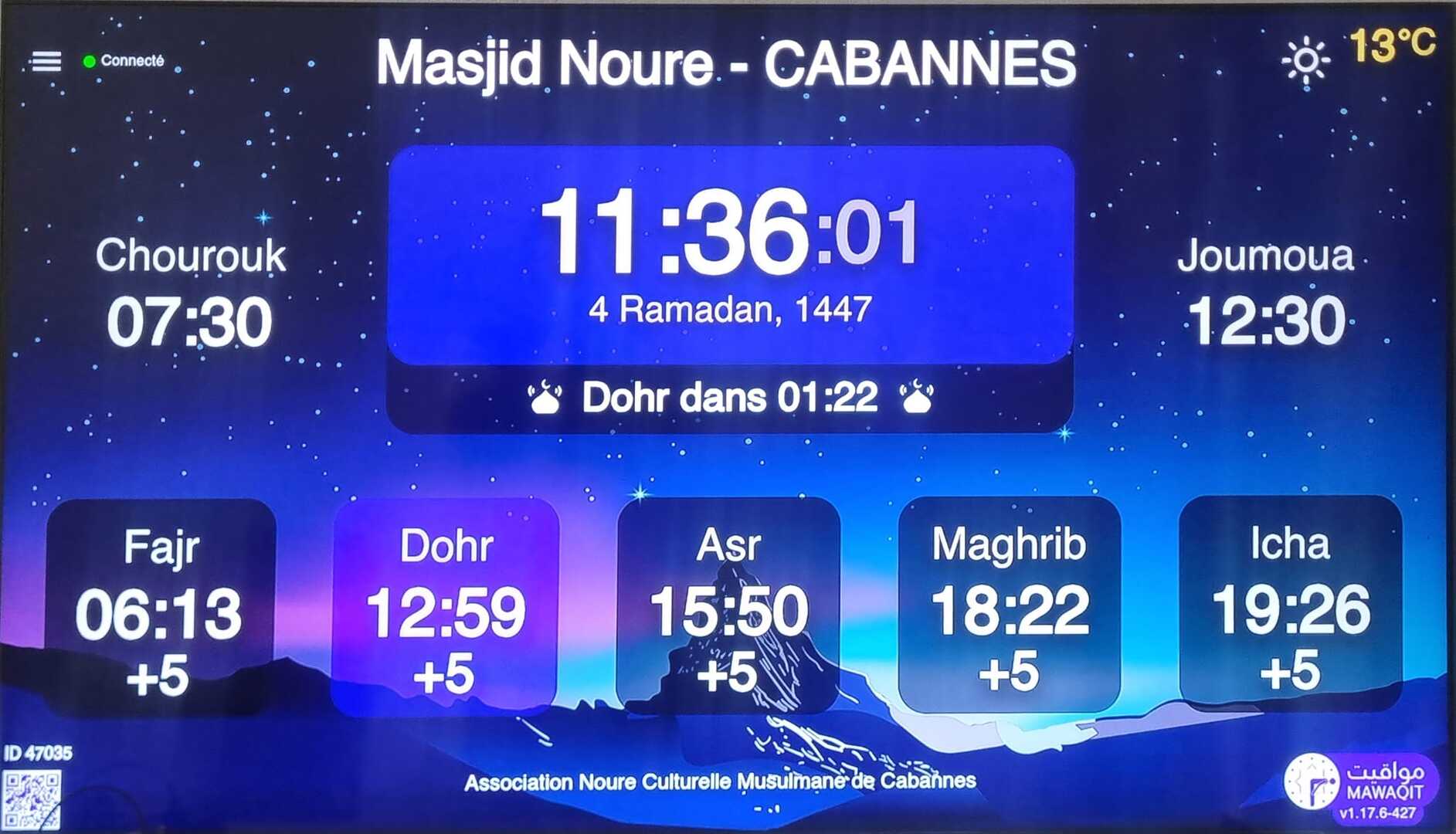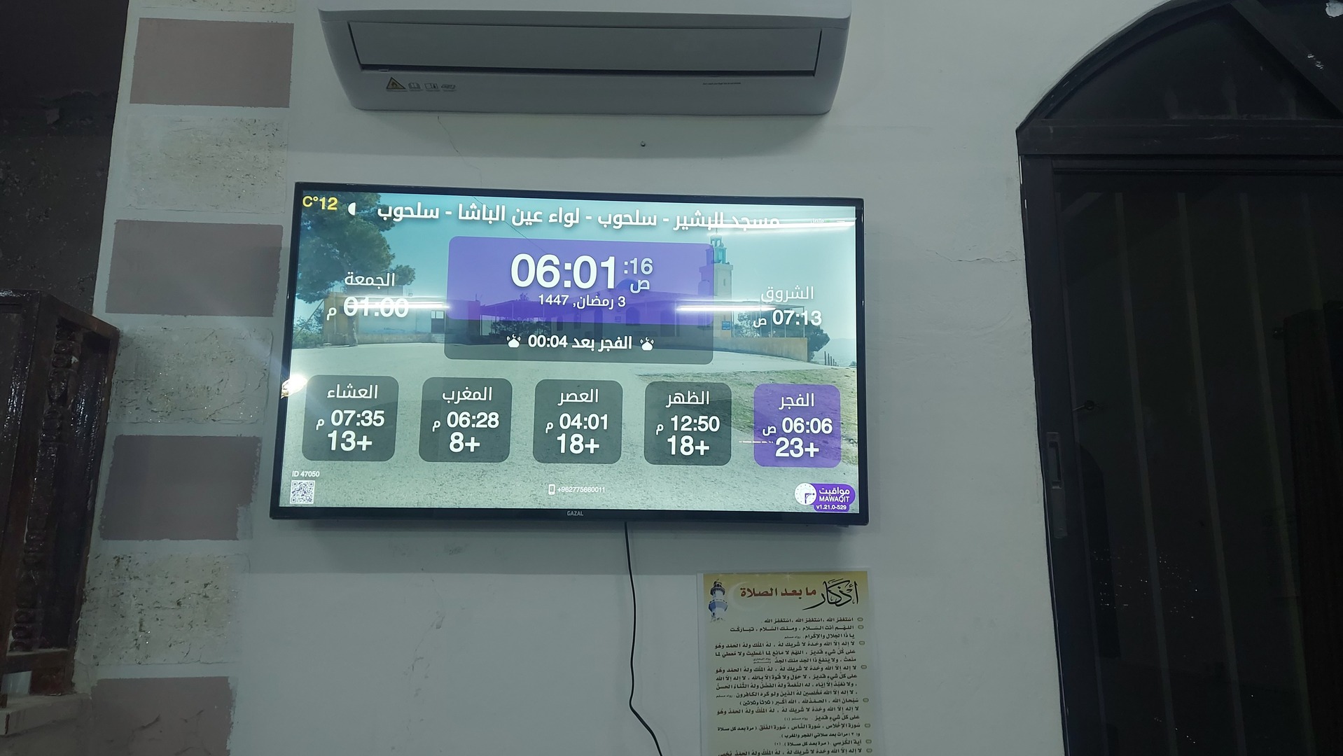 بين الأذان والإقامة ، وبعد كل صلاة ، يتم عرض الأذكار والأدعية. كما يعرض حديث للنبي "صلى الله عليه وسلم" كل 5 دقائق
