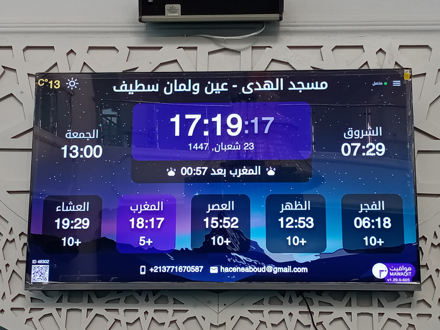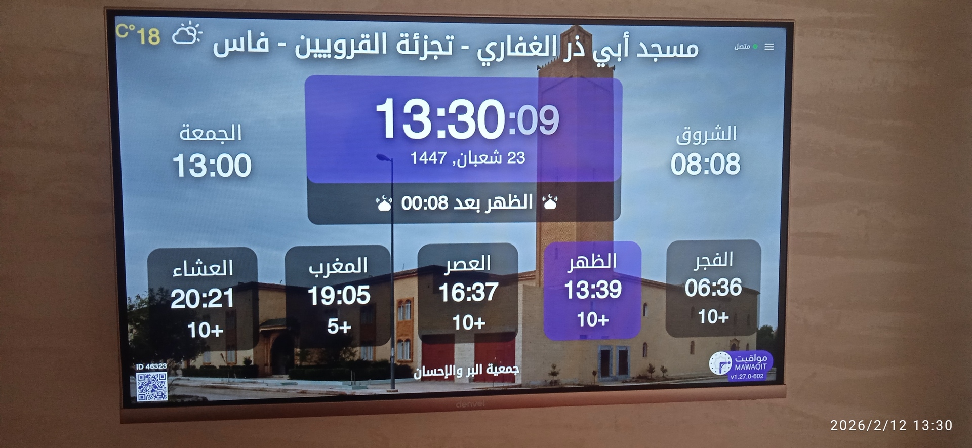 بين الأذان والإقامة ، وبعد كل صلاة ، يتم عرض الأذكار والأدعية. كما يعرض حديث للنبي "صلى الله عليه وسلم" كل 5 دقائق