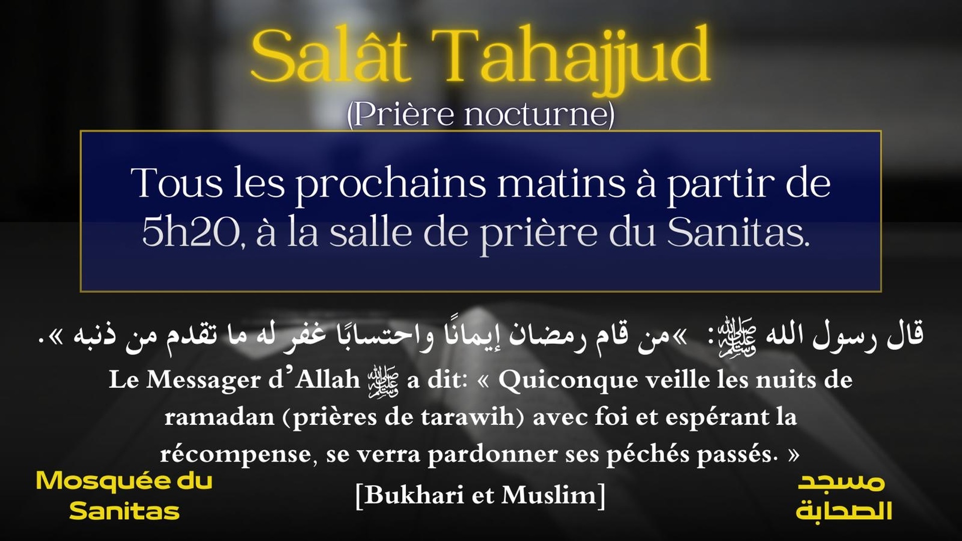 La mosquée est ouverte pour les 5 prières. Elle reste fermée entre la prière du 'Icha et du Fajr et entre la prière du Fajr et la prière de Dohr.