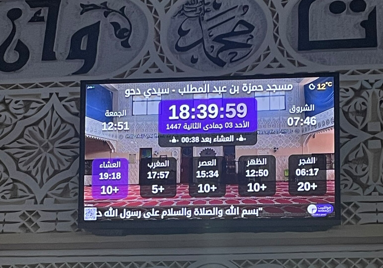 بين الأذان والإقامة ، وبعد كل صلاة ، يتم عرض الأذكار والأدعية. كما يعرض حديث للنبي "صلى الله عليه وسلم" كل 5 دقائق