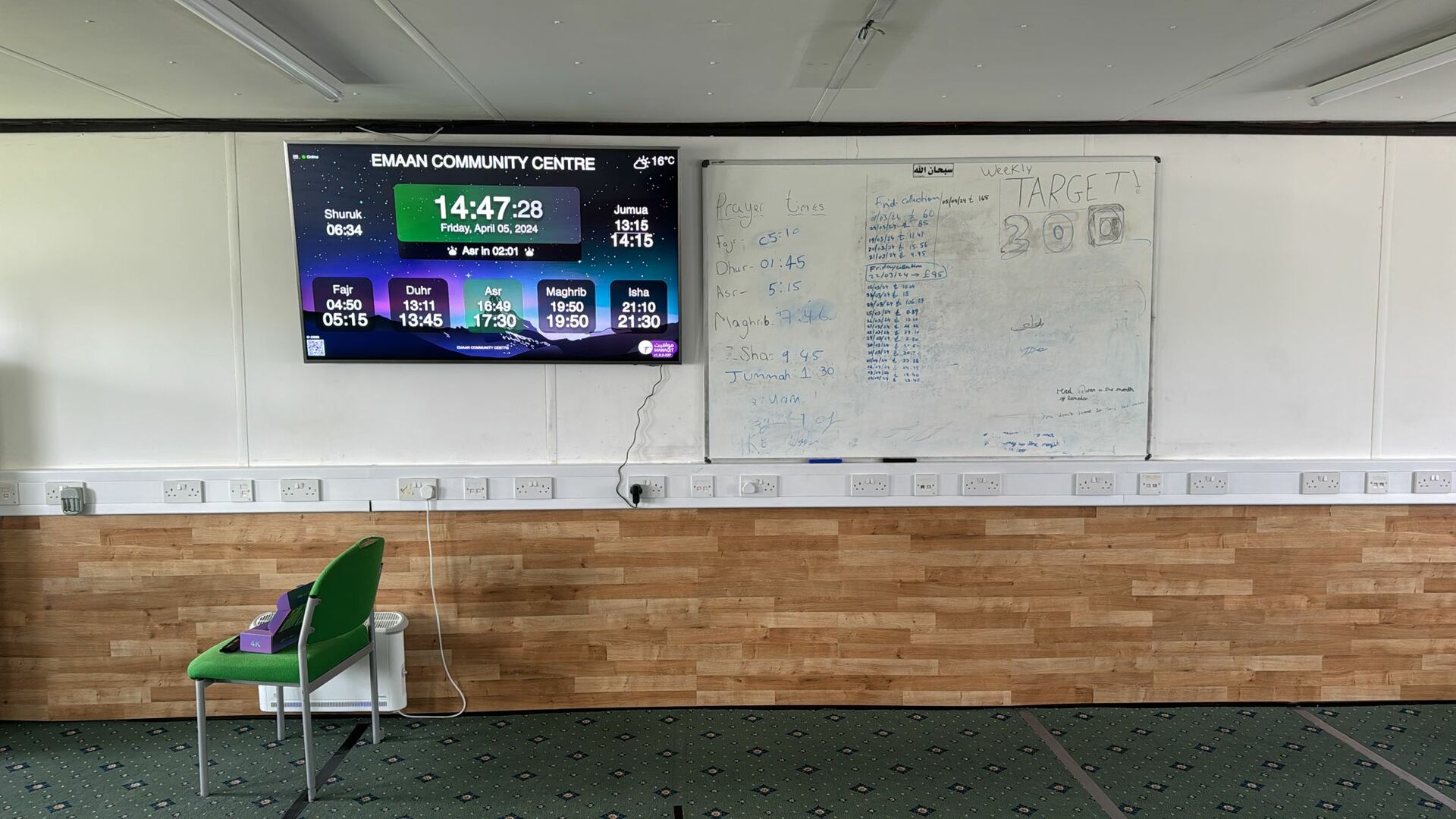 Between the athan and the iqama, and after each prayer, reminders and invocations are displayed. A Prophet's Hadith "May Allah's Prayer and Salvation Be to Him" is also displayed every 5 min