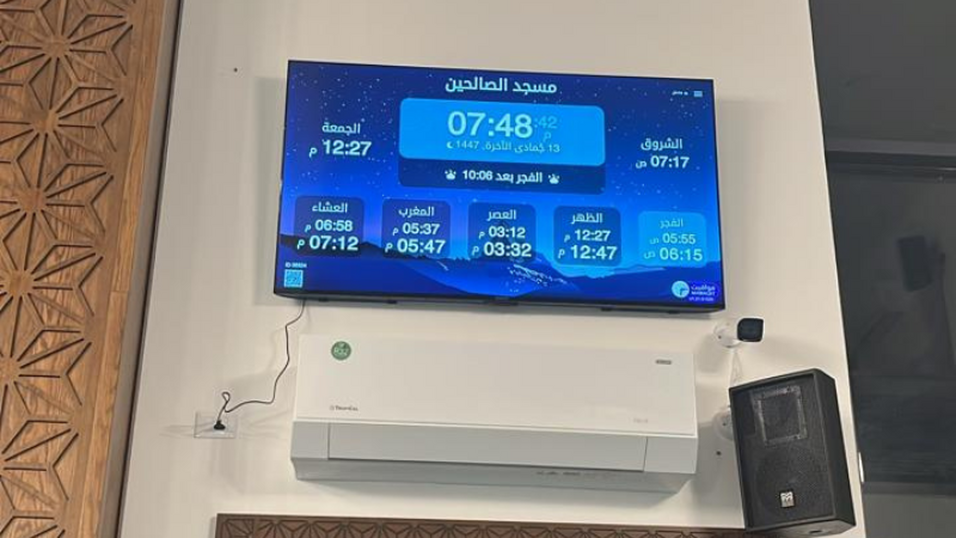 Between the athan and the iqama, and after each prayer, reminders and invocations are displayed. A Prophet's Hadith "May Allah's Prayer and Salvation Be to Him" is also displayed every 5 min