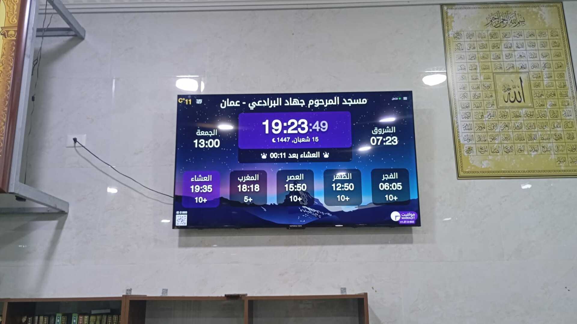 Between the athan and the iqama, and after each prayer, reminders and invocations are displayed. A Prophet's Hadith "May Allah's Prayer and Salvation Be to Him" is also displayed every 5 min