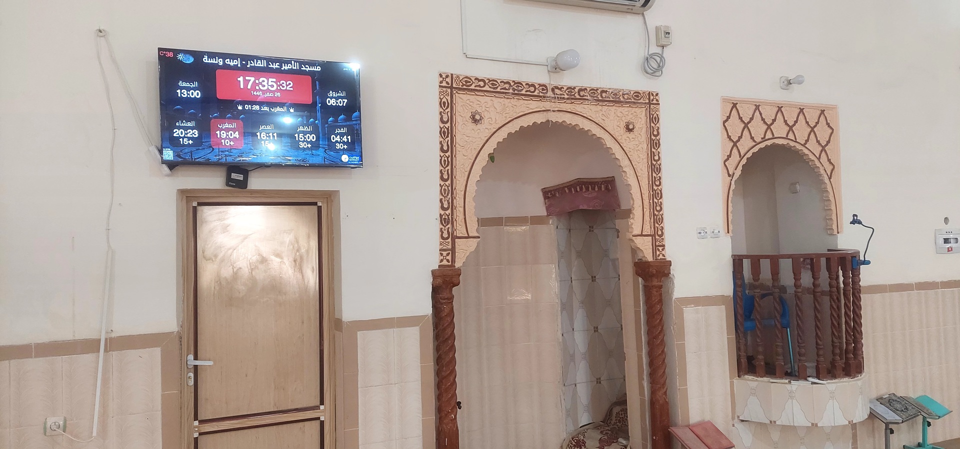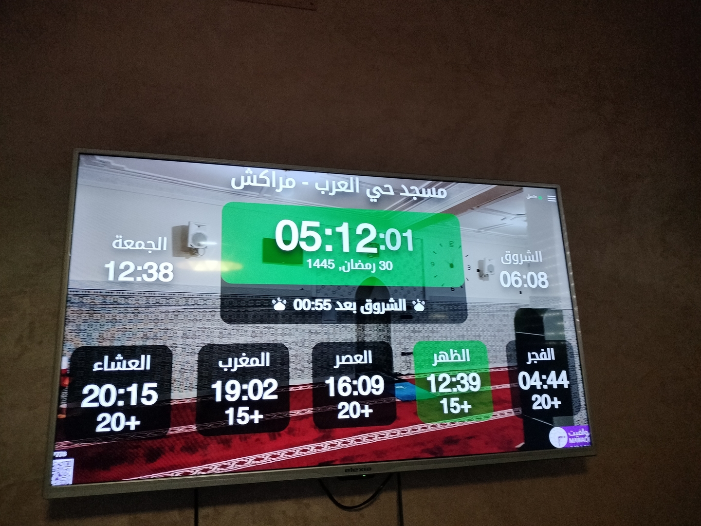 Between the athan and the iqama, and after each prayer, reminders and invocations are displayed. A Prophet's Hadith "May Allah's Prayer and Salvation Be to Him" is also displayed every 5 min