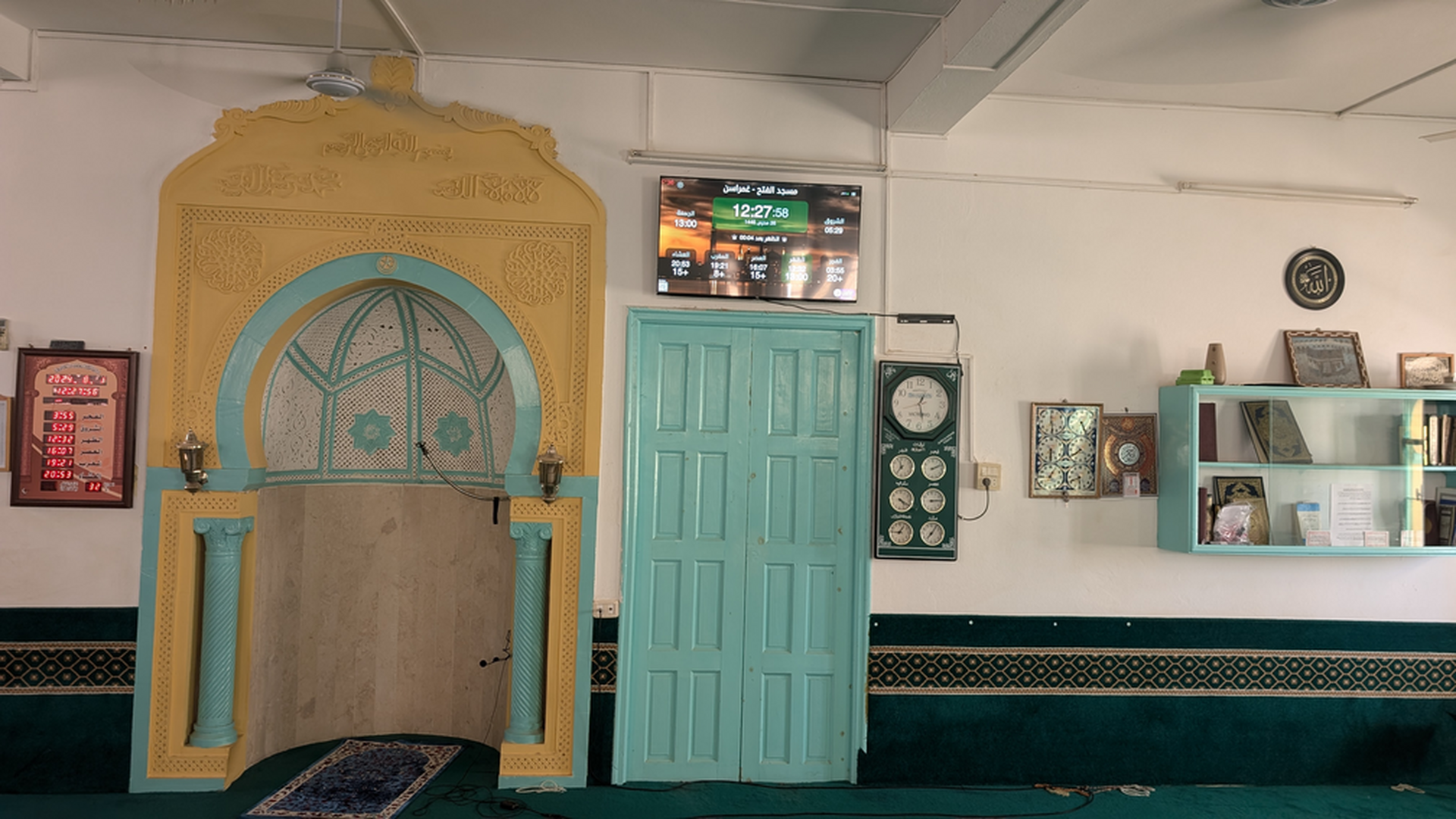 Between the athan and the iqama, and after each prayer, reminders and invocations are displayed. A Prophet's Hadith "May Allah's Prayer and Salvation Be to Him" is also displayed every 5 min
