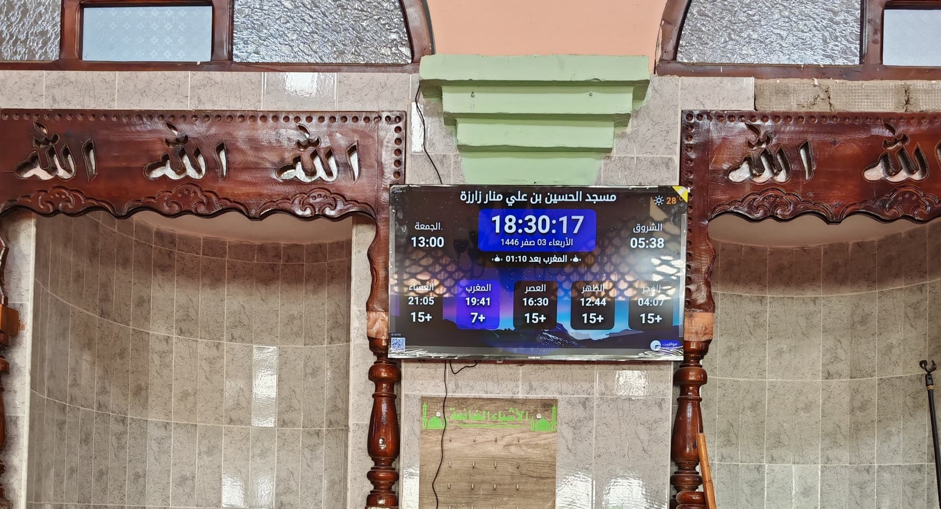 Between the athan and the iqama, and after each prayer, reminders and invocations are displayed. A Prophet's Hadith "May Allah's Prayer and Salvation Be to Him" is also displayed every 5 min