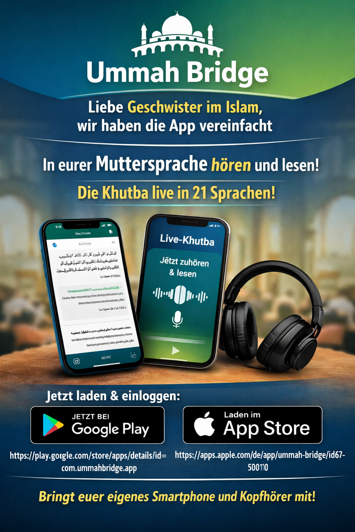 Der Prophet ( Allahs Frieden und Segen auf ihm) hat gesagt: "Derjenige der in einer schönen weise seine Gebetswaschung vollzieht und dann zum Freitagsgebet kommt, leise die Khutba zuhört, dessen Sünden werden zwichen den zwei Freitage und noch drei Tage, vergeben. Und wer während der Khutba mit Kieselsteine spielt, der macht etwas sinnloses"