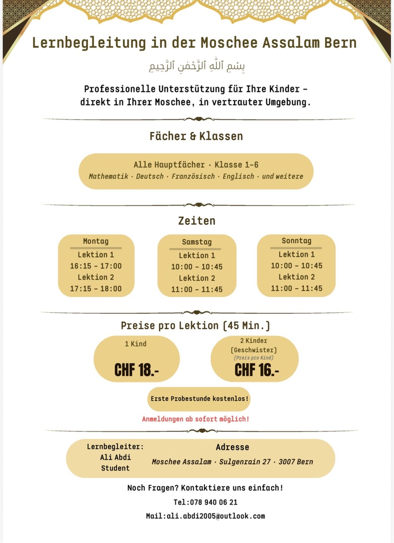 wir freuen uns, euch mitteilen zu dürfen, dass ab sofort eine Lernbegleitung für eure Kinder in der Moschee Assalam angeboten wird.