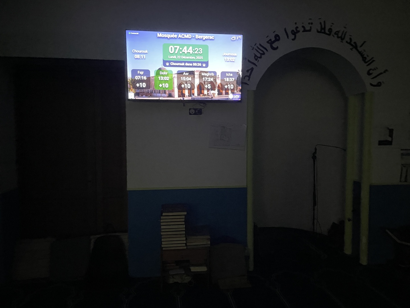 Between the athan and the iqama, and after each prayer, reminders and invocations are displayed. A Prophet's Hadith "May Allah's Prayer and Salvation Be to Him" is also displayed every 5 min