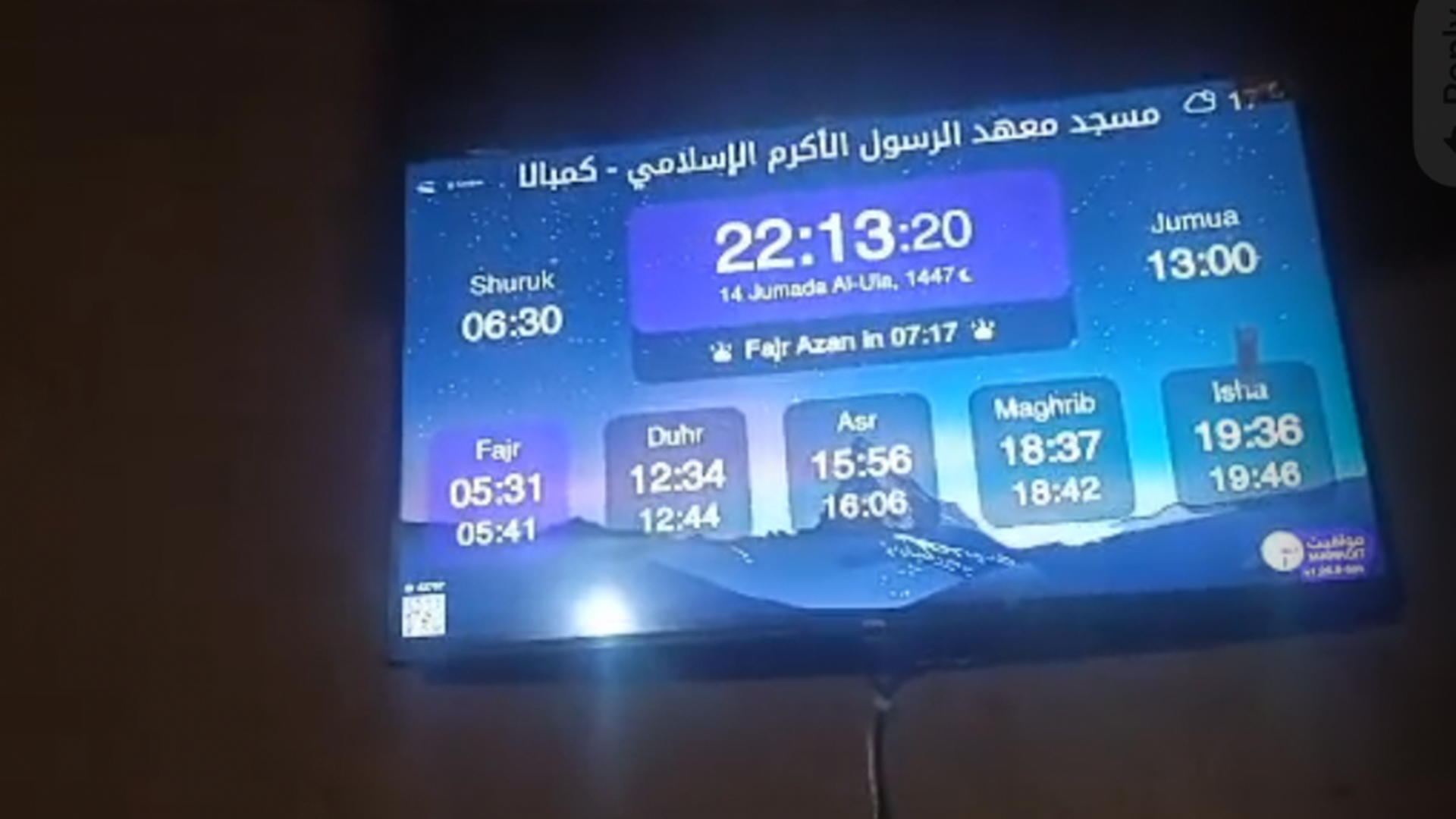 Between the athan and the iqama, and after each prayer, reminders and invocations are displayed. A Prophet's Hadith "May Allah's Prayer and Salvation Be to Him" is also displayed every 5 min
