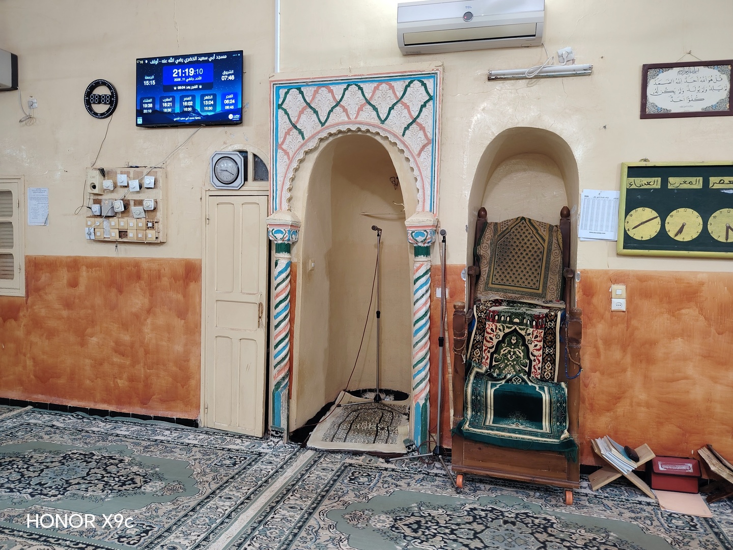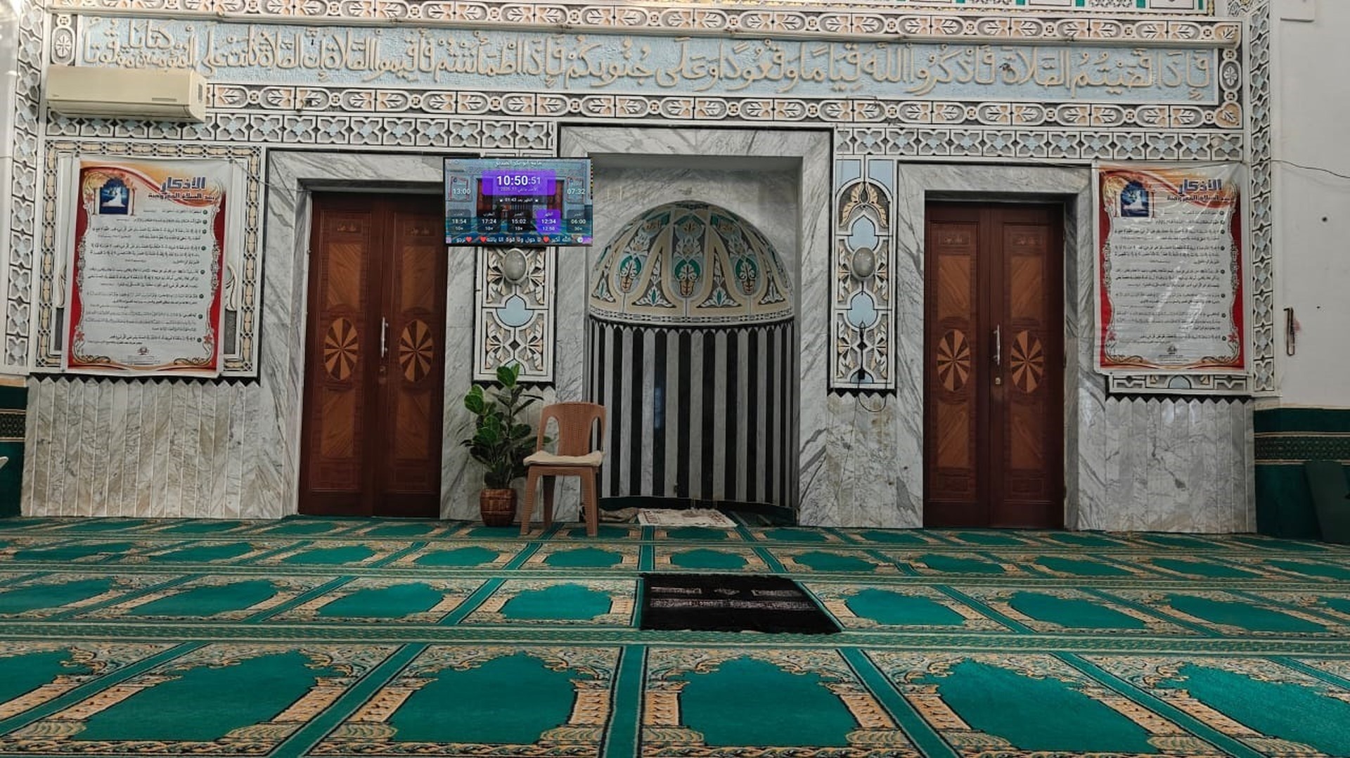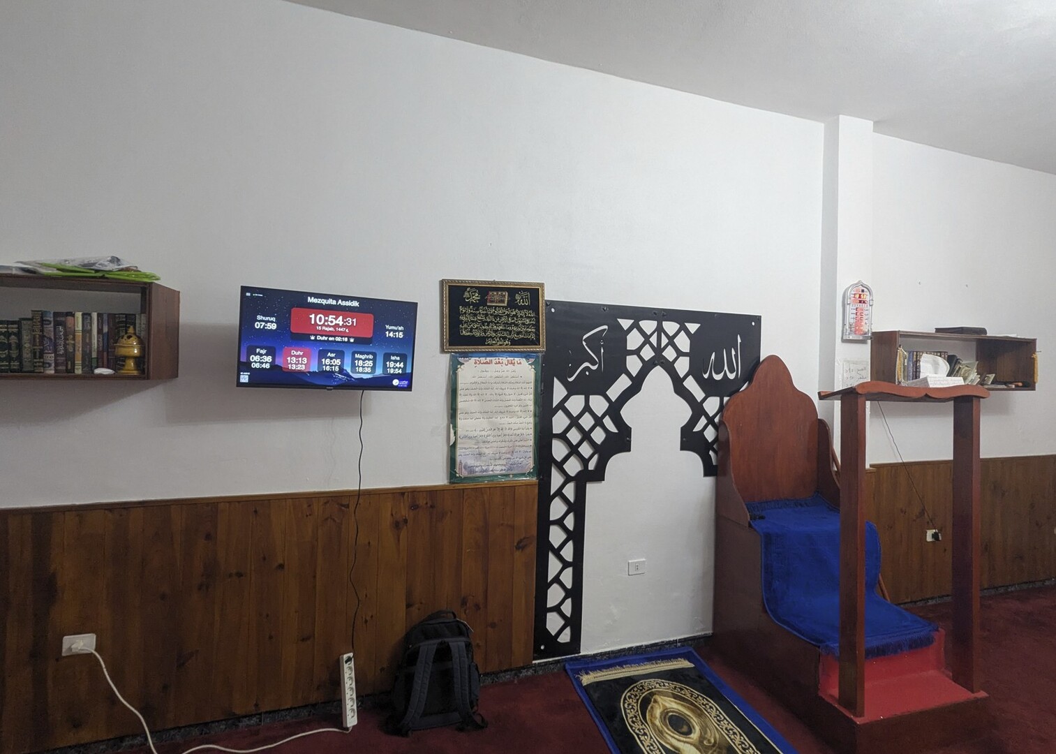 Between the athan and the iqama, and after each prayer, reminders and invocations are displayed. A Prophet's Hadith "May Allah's Prayer and Salvation Be to Him" is also displayed every 5 min