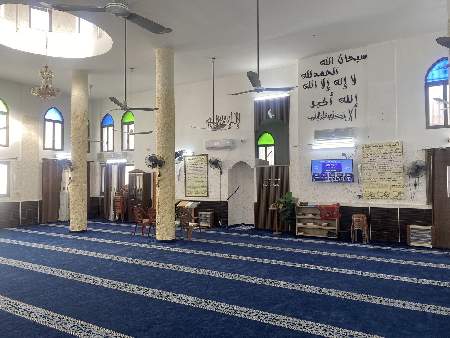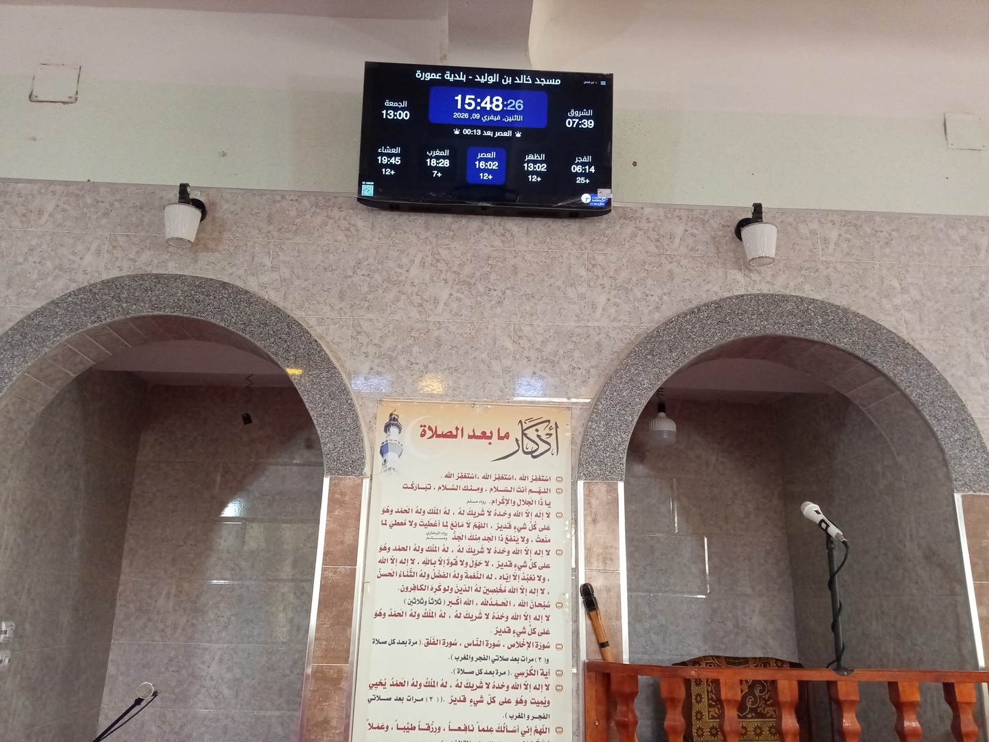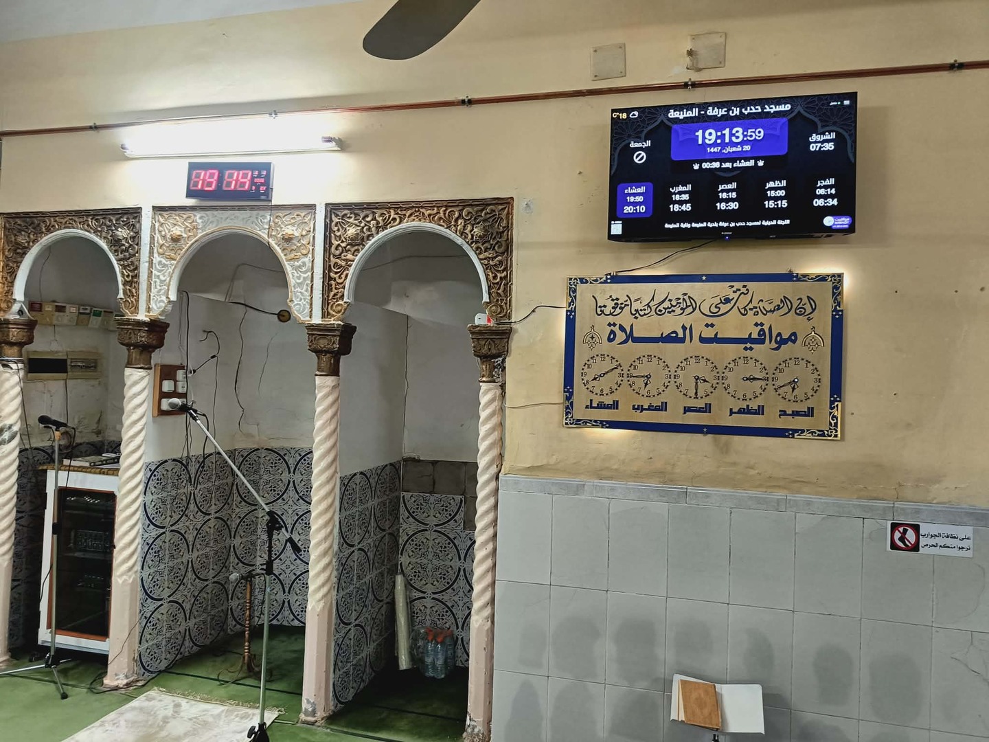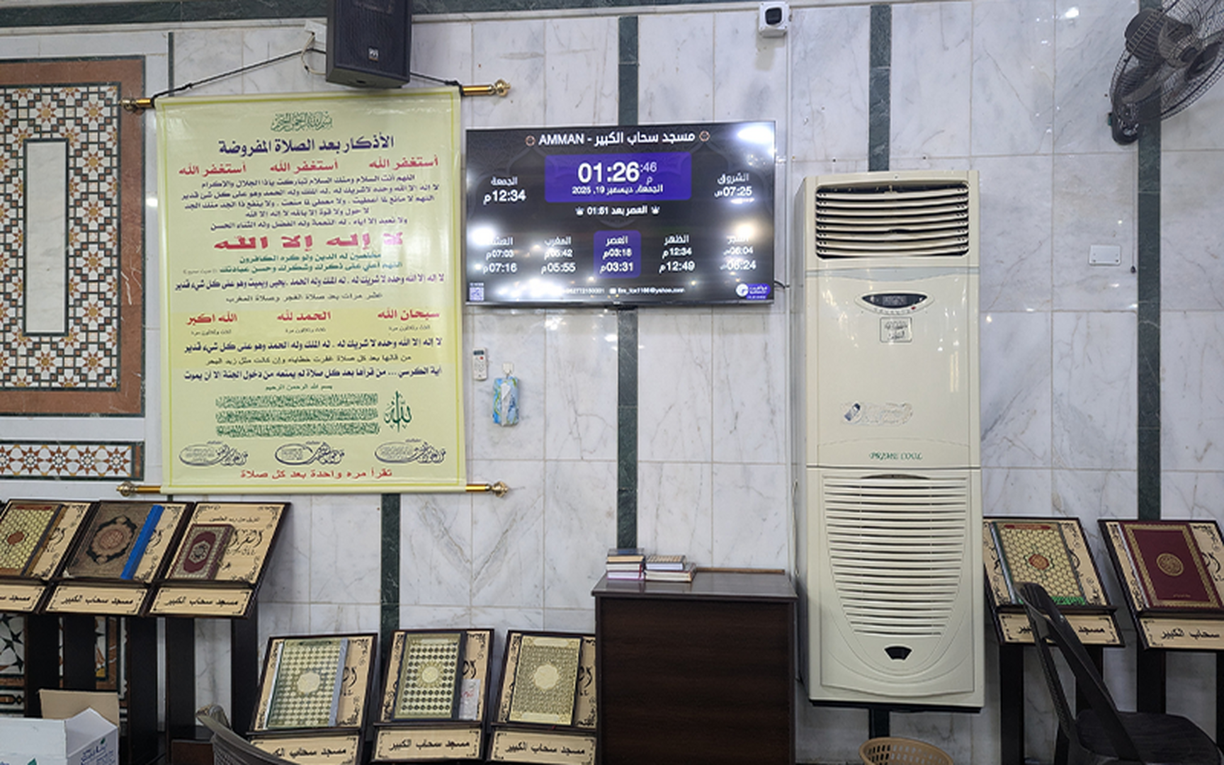 Between the athan and the iqama, and after each prayer, reminders and invocations are displayed. A Prophet's Hadith "May Allah's Prayer and Salvation Be to Him" is also displayed every 5 min