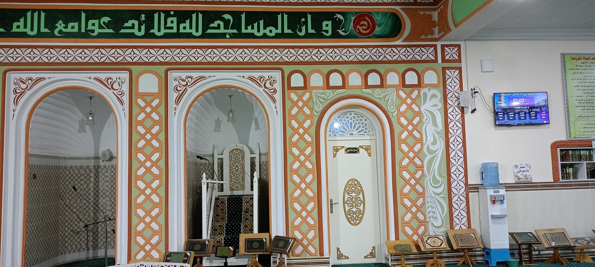 Between the athan and the iqama, and after each prayer, reminders and invocations are displayed. A Prophet's Hadith "May Allah's Prayer and Salvation Be to Him" is also displayed every 5 min