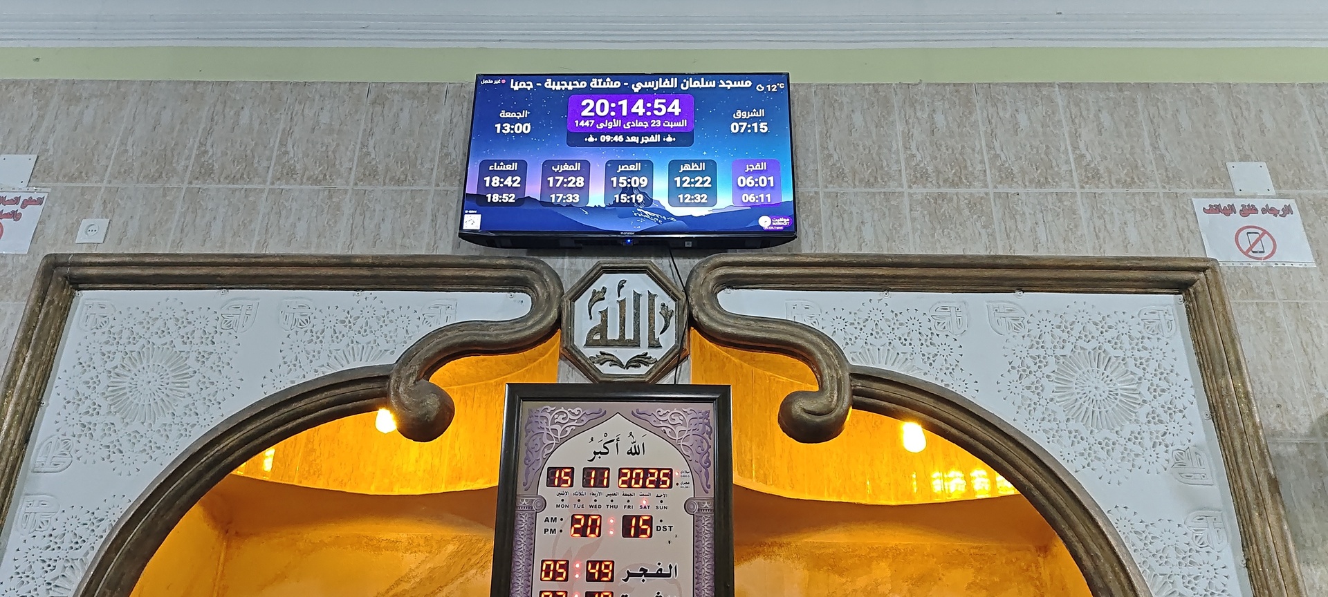 Between the athan and the iqama, and after each prayer, reminders and invocations are displayed. A Prophet's Hadith "May Allah's Prayer and Salvation Be to Him" is also displayed every 5 min