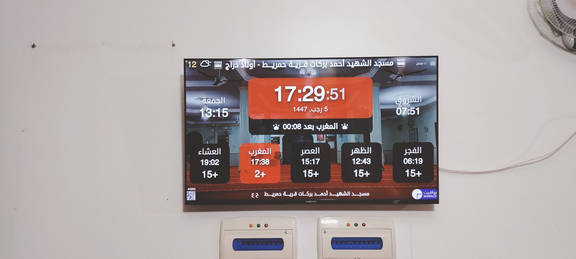 Between the athan and the iqama, and after each prayer, reminders and invocations are displayed. A Prophet's Hadith "May Allah's Prayer and Salvation Be to Him" is also displayed every 5 min