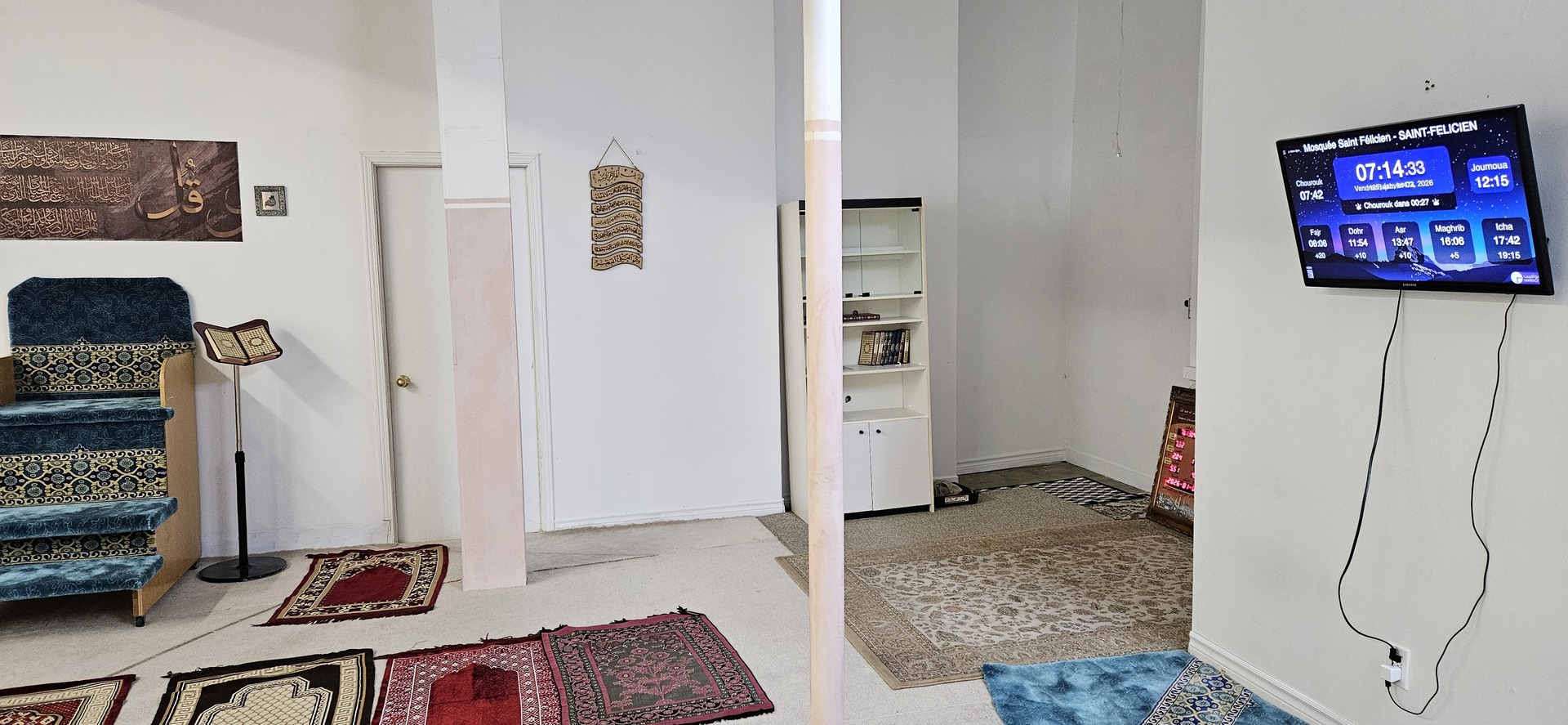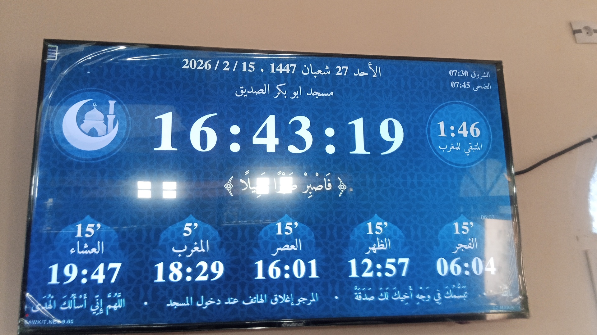 Between the athan and the iqama, and after each prayer, reminders and invocations are displayed. A Prophet's Hadith "May Allah's Prayer and Salvation Be to Him" is also displayed every 5 min