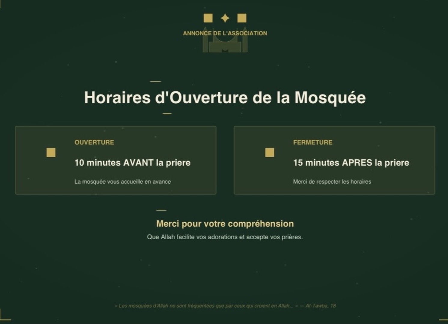 OUVERTURE - FERMETURE MOSQUÉE