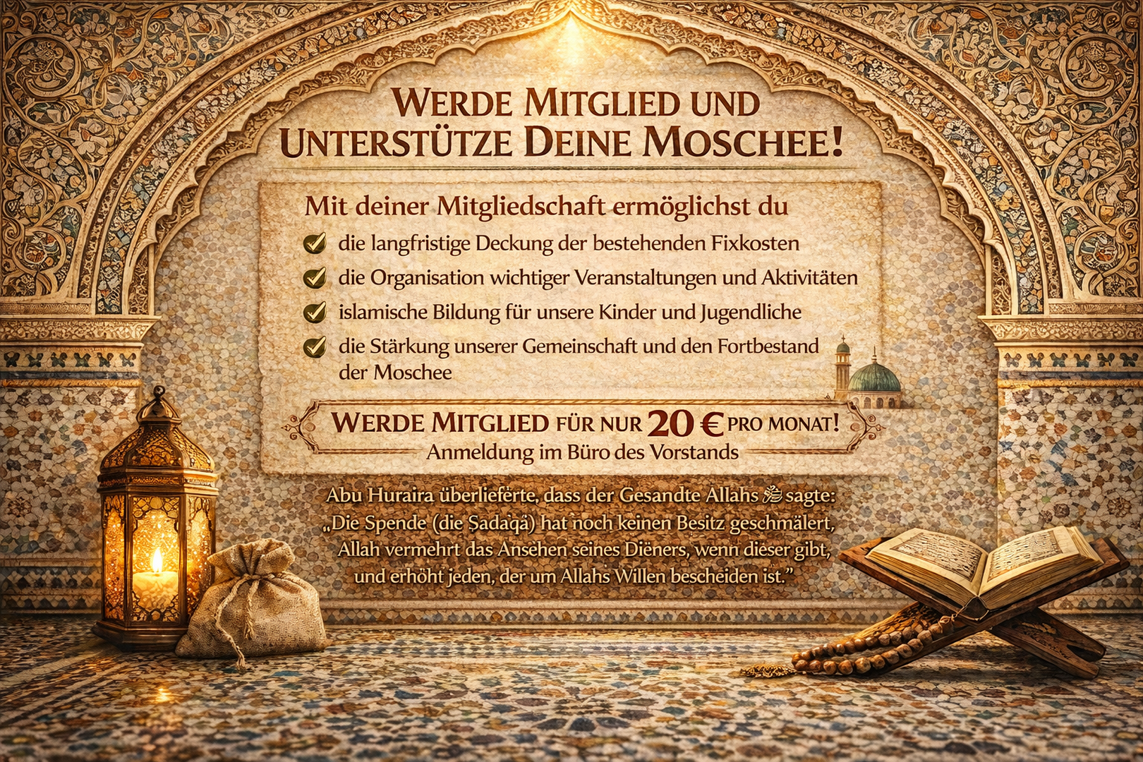 O Allah, Master of this perfect call and the prayer that we are going to perform, gives Muhammad the power to intercede (the Day of Judgment) and the place of honor [in Paradise], and resurrect him in the laudable position that You promised him