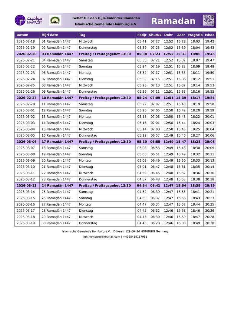 Gebetszeiten in Ramadan 1447 Hijri /2026