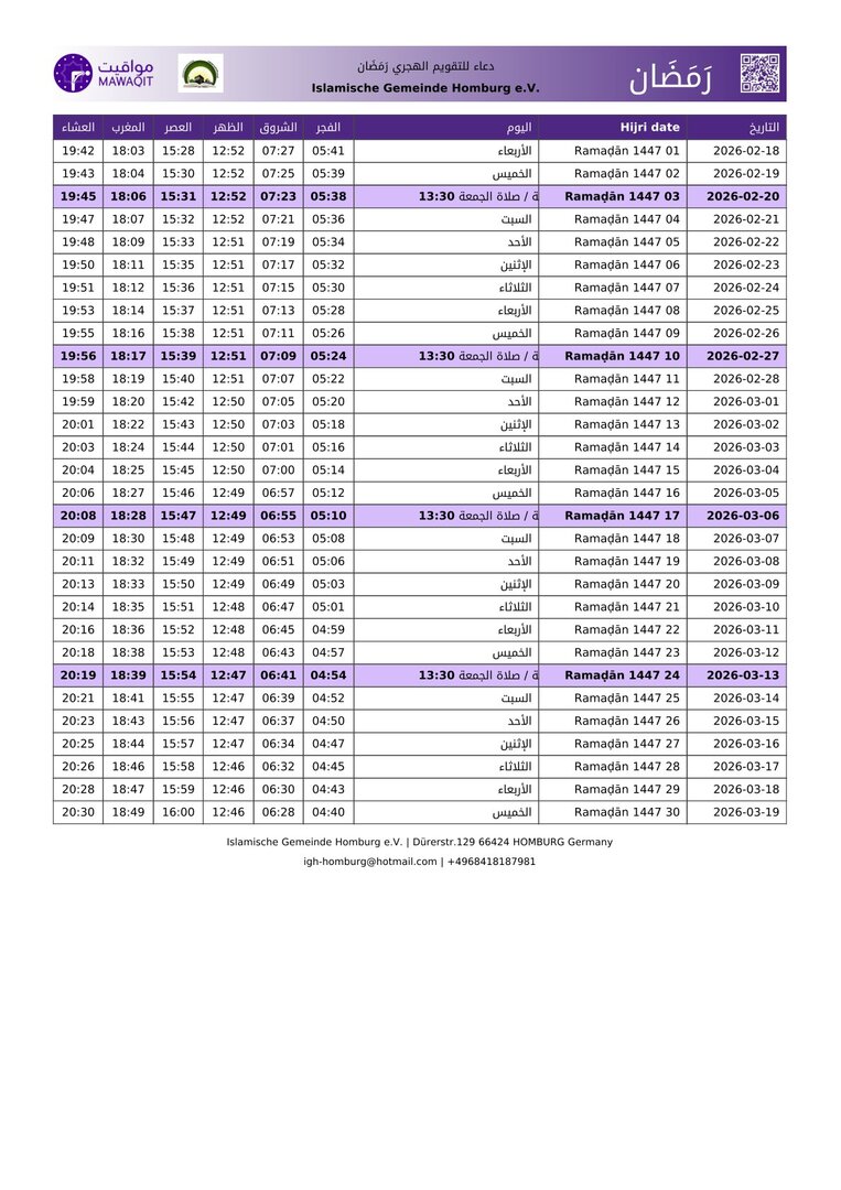 أوقات الصلاة مدينة هومبورج ٢٠٢٦ Gebetszeiten Homburg 2026