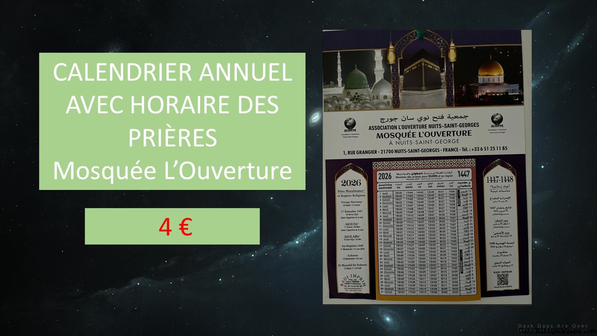 VENTE DE CALENDRIER DE PRIÈRE AU PROFIT DE L’ASSOCIATION AU PRIX DE 4€. CONTACT HAJ EL GURCH