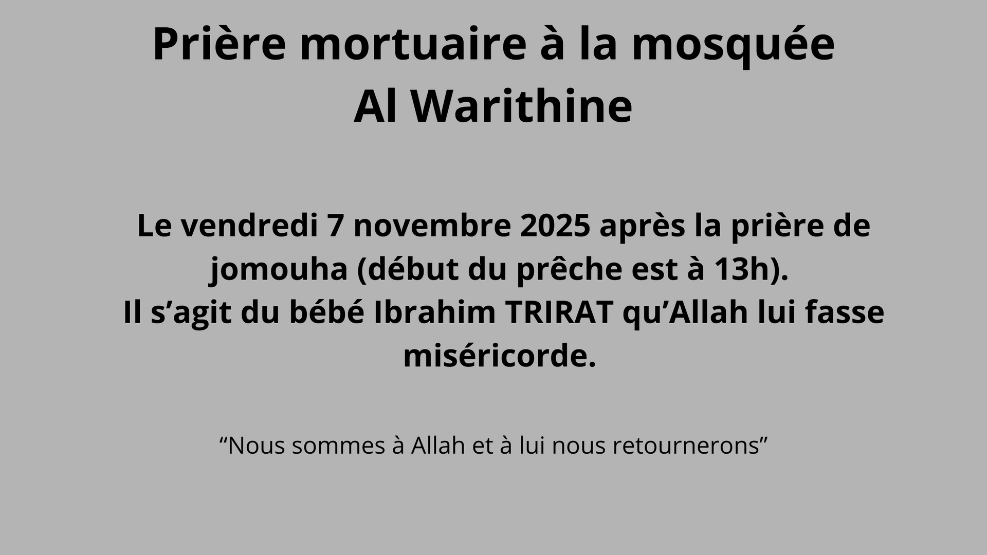 Prière mortuaire après la prière de jomouha ce vendredi inch'Allah. Il s'agit du bébé Ibrahim TRIRAT qu'Allah accorde la patience à ses parents.