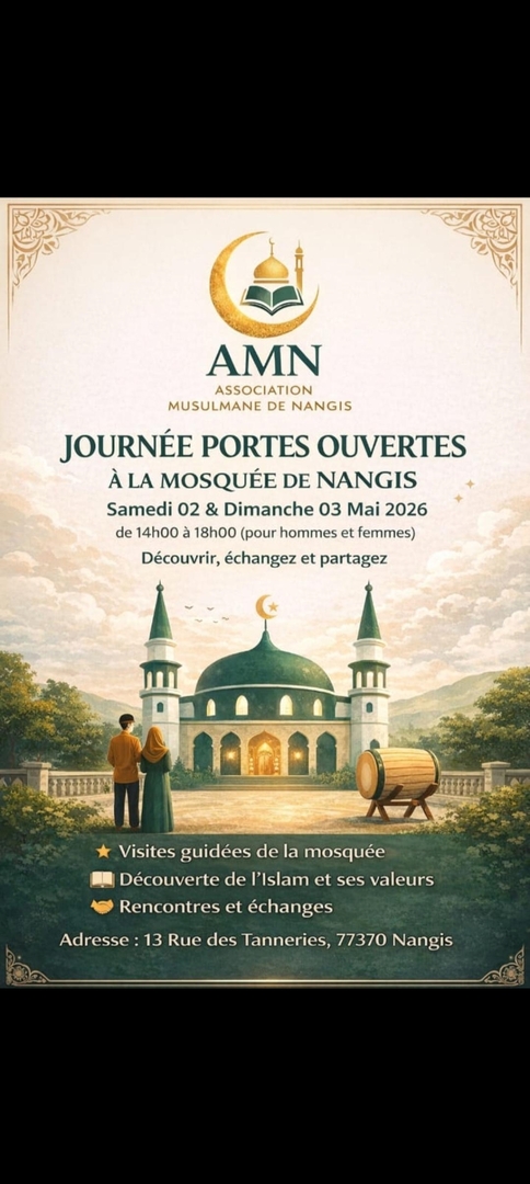 Portes ouvertes – Mosquée de Nangis Samedi 2 & dimanche 3 mai 2026, de 14h à 18h. Visites guidées, échanges et découverte de l’islam. Vous êtes les bienvenus !
