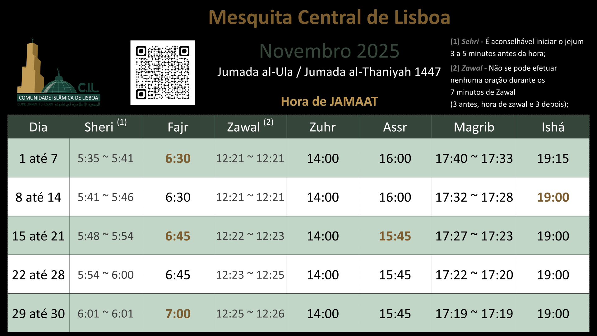 Secretaria, Sala de Culto (homens e senhoras), Madrassah, Salas de Aulas, Biblioteca, Sala de Conferência, Sala Funerária, Restaurante, Salão Eventos, Pavilhão Desportivo.