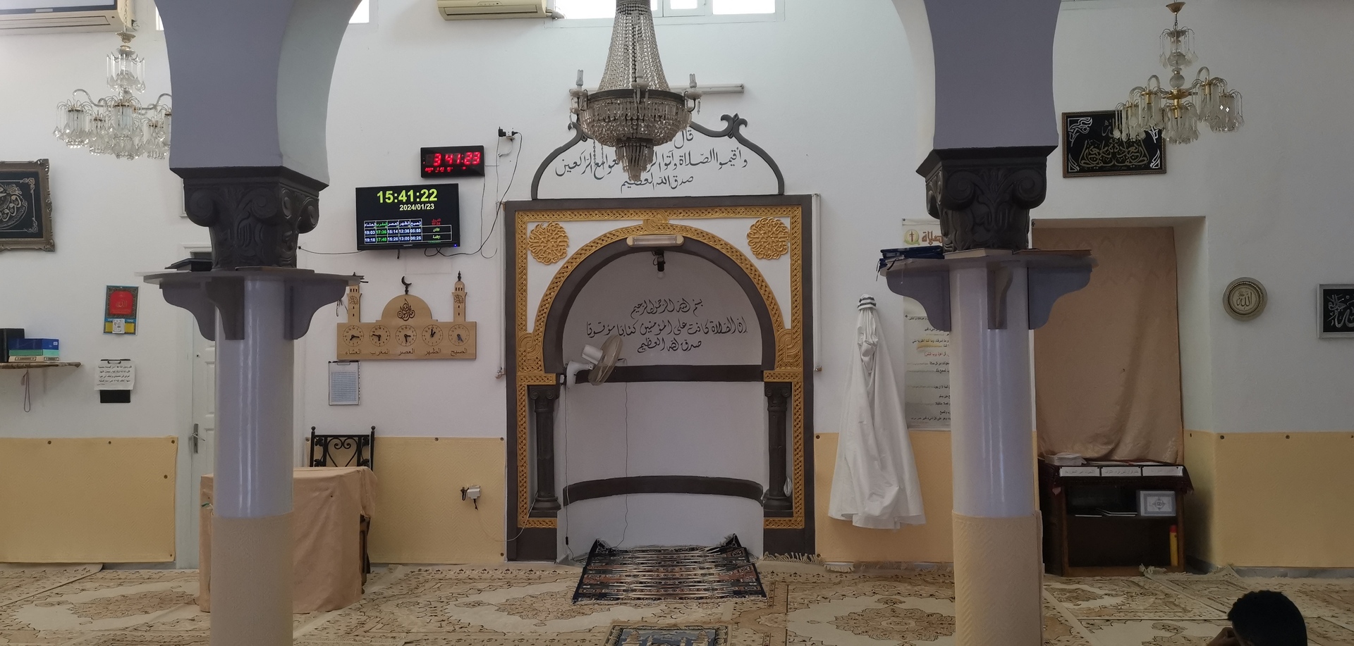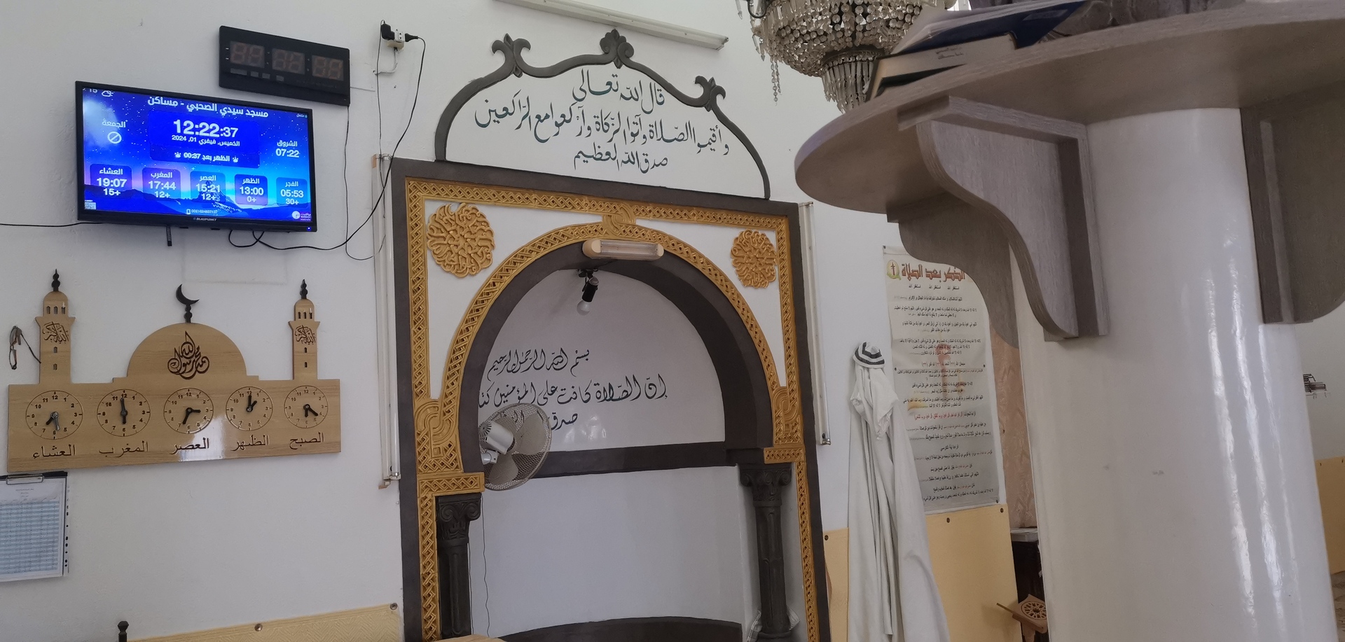 Between the athan and the iqama, and after each prayer, reminders and invocations are displayed. A Prophet's Hadith "May Allah's Prayer and Salvation Be to Him" is also displayed every 5 min
