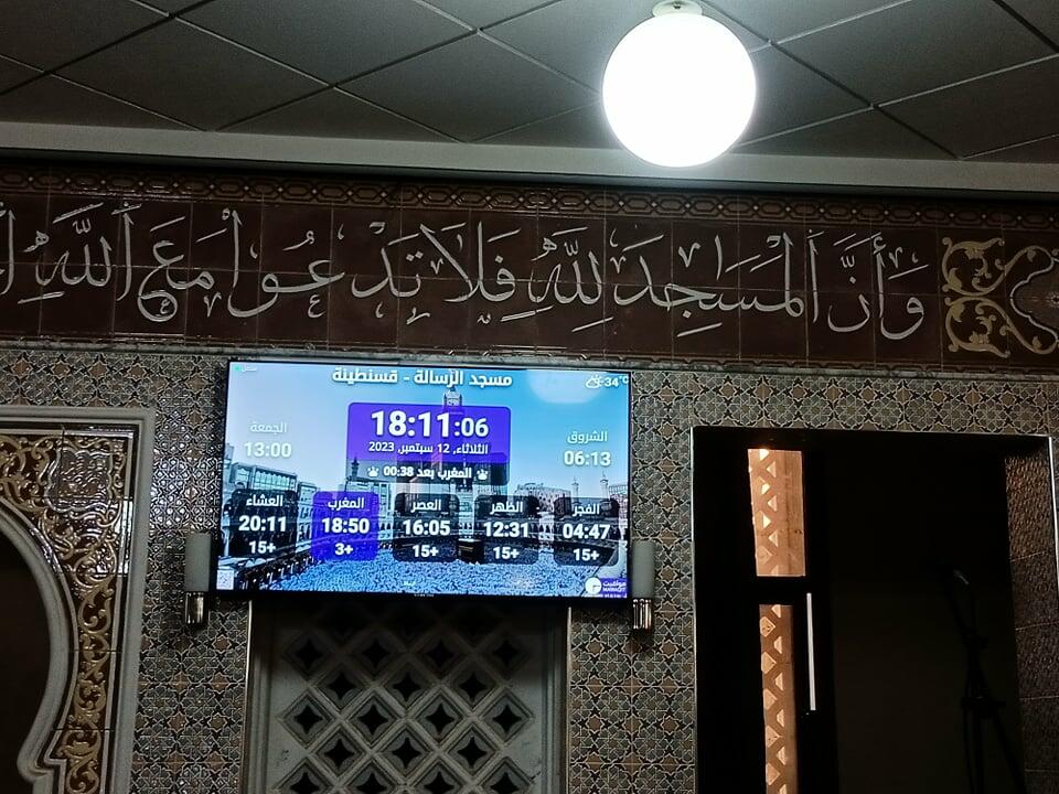 Between the athan and the iqama, and after each prayer, reminders and invocations are displayed. A Prophet's Hadith "May Allah's Prayer and Salvation Be to Him" is also displayed every 5 min