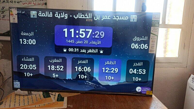Between the athan and the iqama, and after each prayer, reminders and invocations are displayed. A Prophet's Hadith "May Allah's Prayer and Salvation Be to Him" is also displayed every 5 min