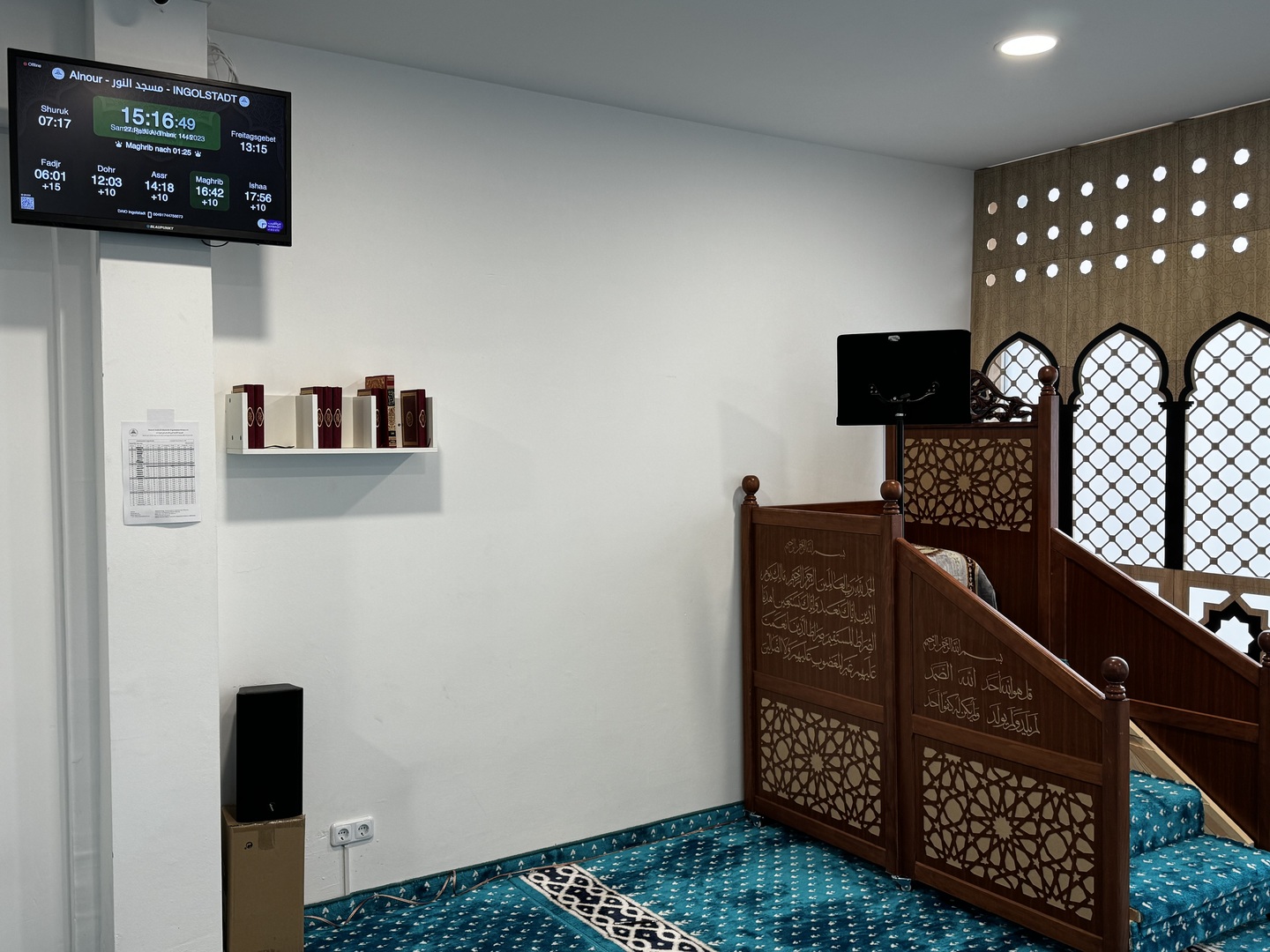 Between the athan and the iqama, and after each prayer, reminders and invocations are displayed. A Prophet's Hadith "May Allah's Prayer and Salvation Be to Him" is also displayed every 5 min
