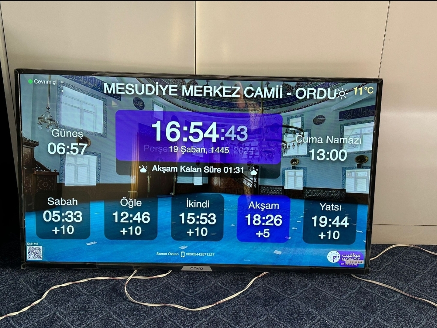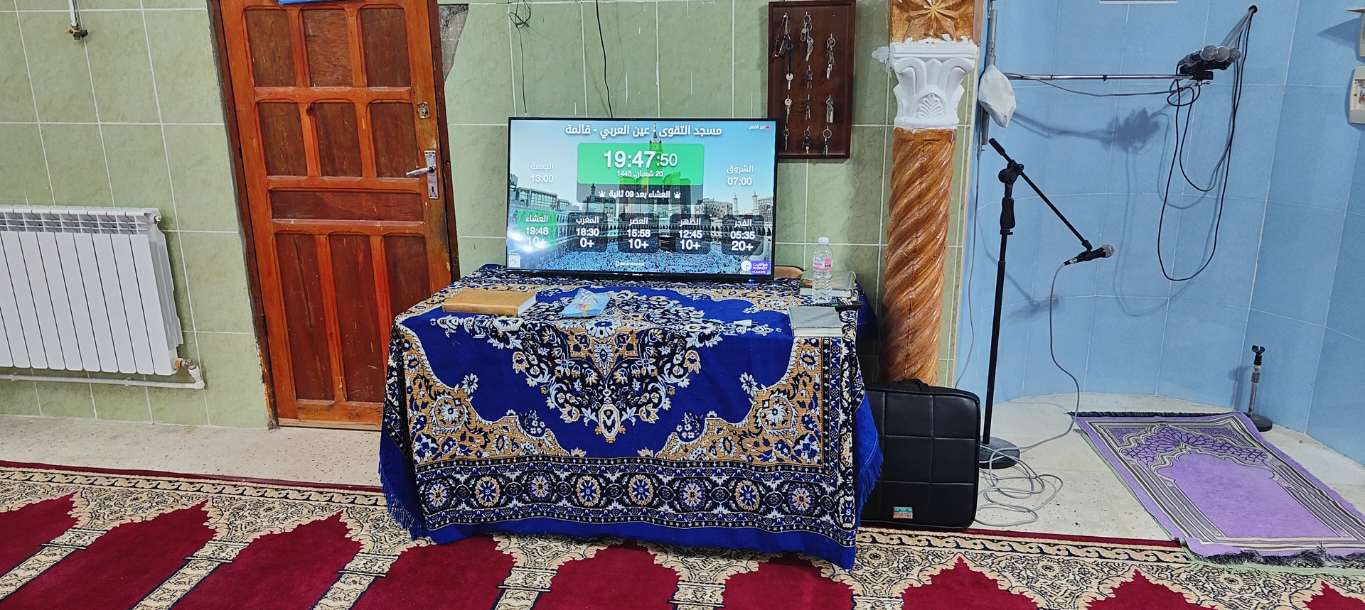 Between the athan and the iqama, and after each prayer, reminders and invocations are displayed. A Prophet's Hadith "May Allah's Prayer and Salvation Be to Him" is also displayed every 5 min