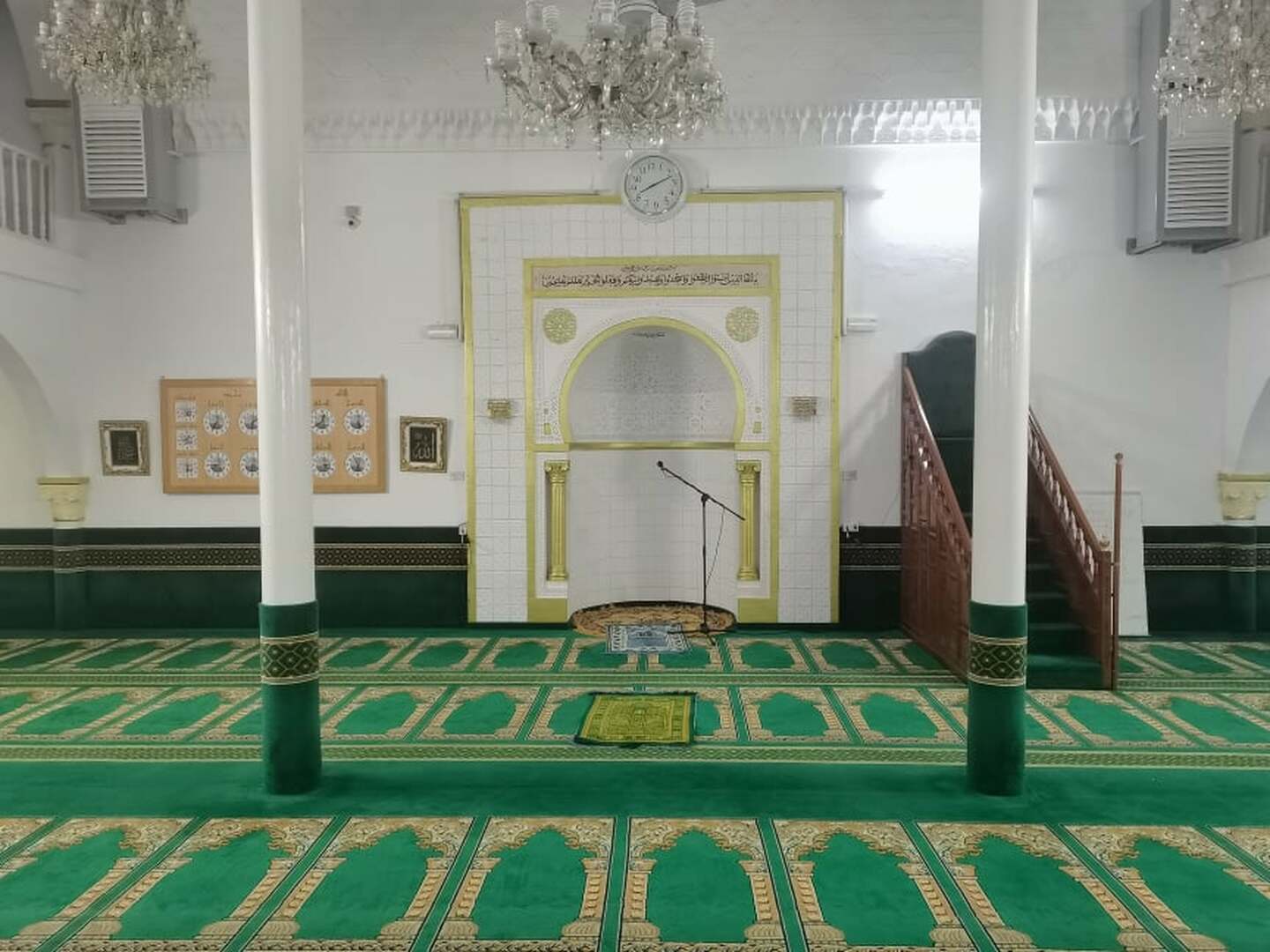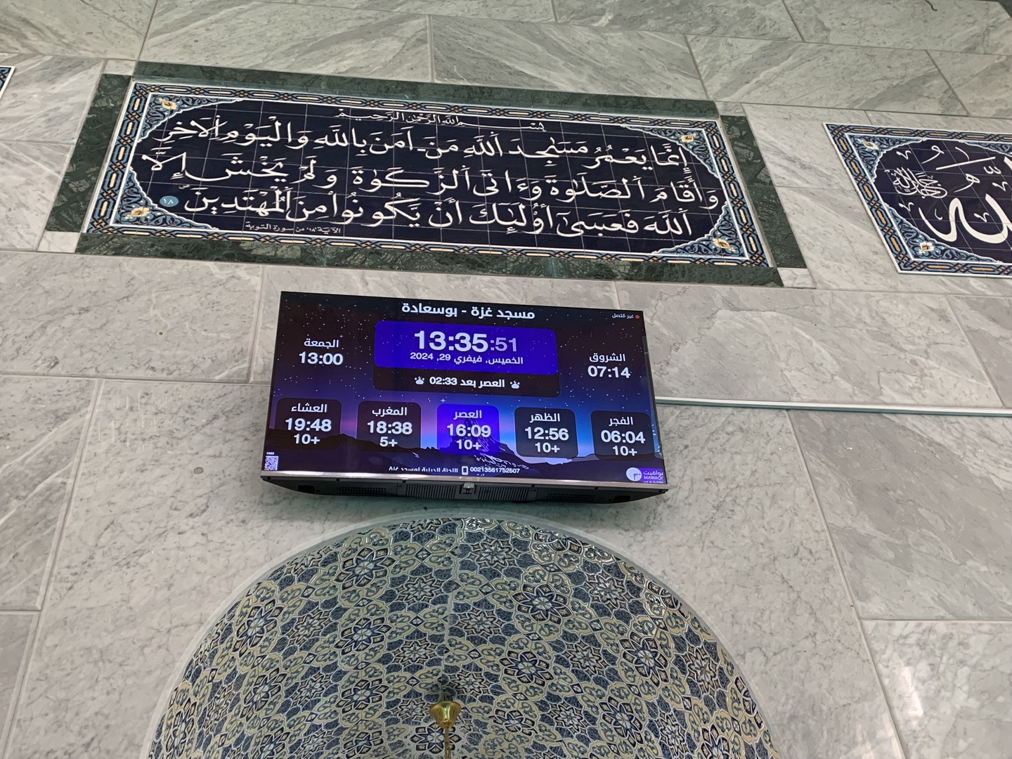 Between the athan and the iqama, and after each prayer, reminders and invocations are displayed. A Prophet's Hadith "May Allah's Prayer and Salvation Be to Him" is also displayed every 5 min