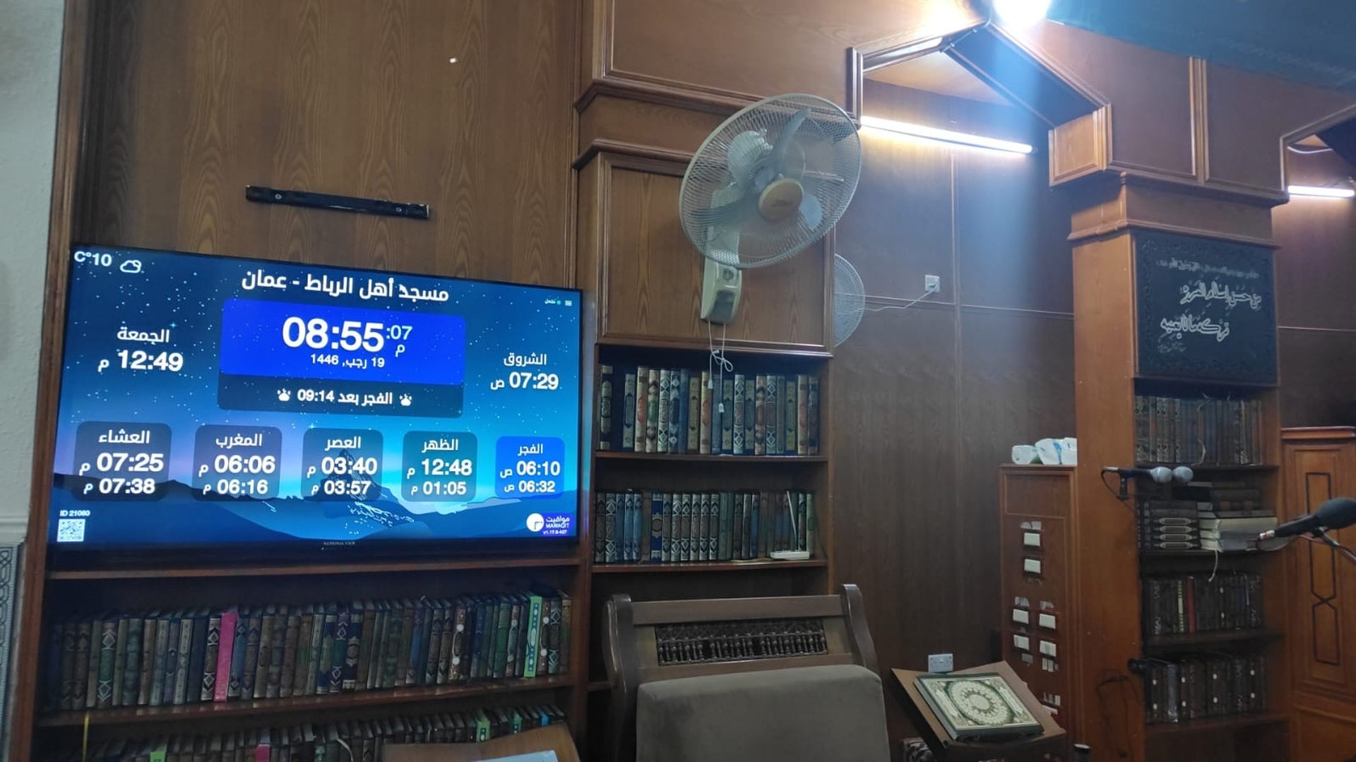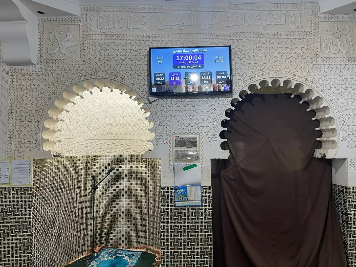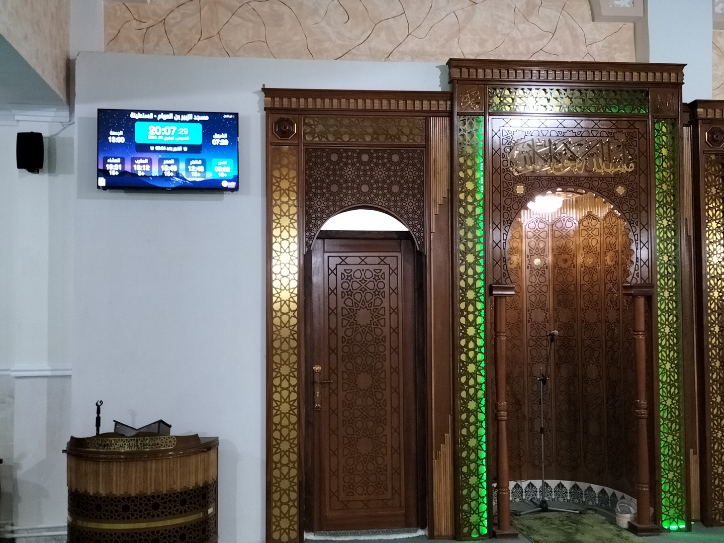 Between the athan and the iqama, and after each prayer, reminders and invocations are displayed. A Prophet's Hadith "May Allah's Prayer and Salvation Be to Him" is also displayed every 5 min