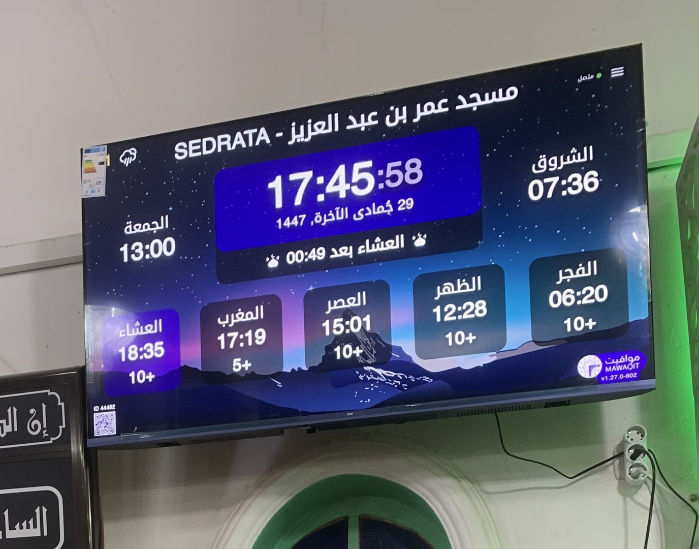 Entre l'adhan et iqama, et après chaque prière, des rappels et invocations sont affichés. Un hadith du prophète "que la prière d'Allah et son salut soient sur lui" est également affiché toutes les 5 min