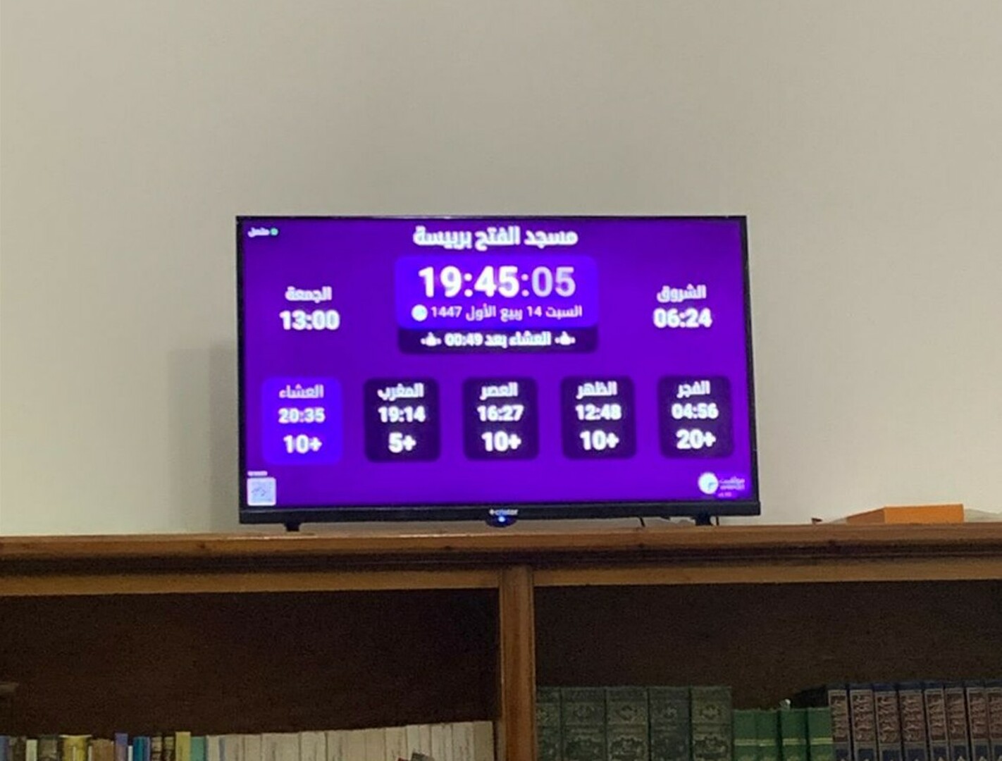 Entre l'adhan et iqama, et après chaque prière, des rappels et invocations sont affichés. Un hadith du prophète "que la prière d'Allah et son salut soient sur lui" est également affiché toutes les 5 min
