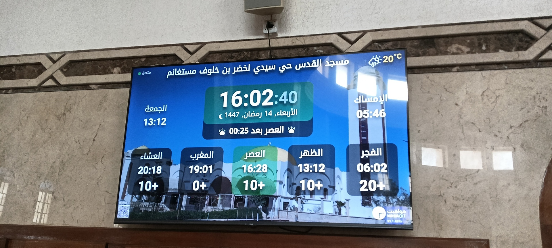 Entre l'adhan et iqama, et après chaque prière, des rappels et invocations sont affichés. Un hadith du prophète "que la prière d'Allah et son salut soient sur lui" est également affiché toutes les 5 min