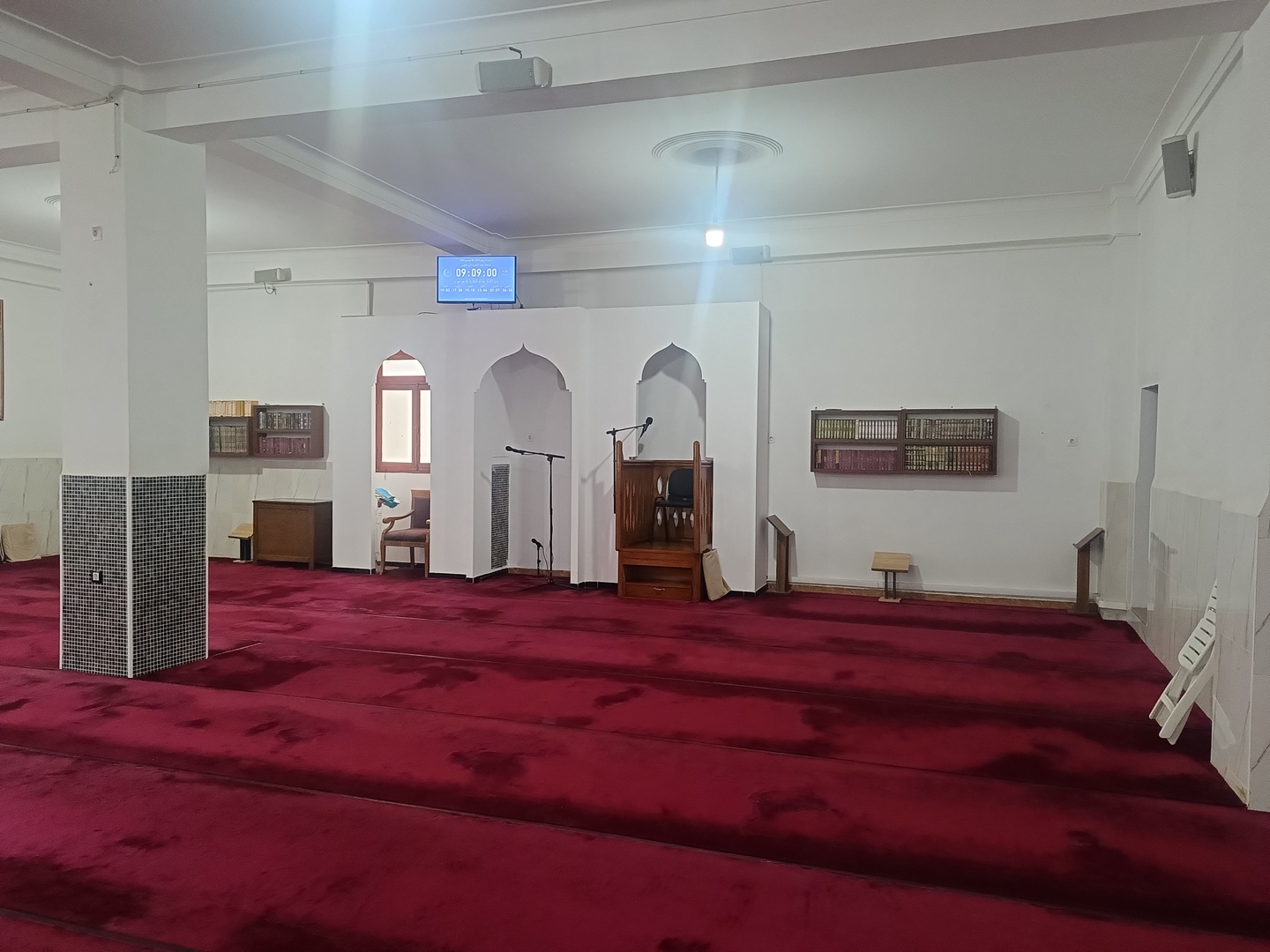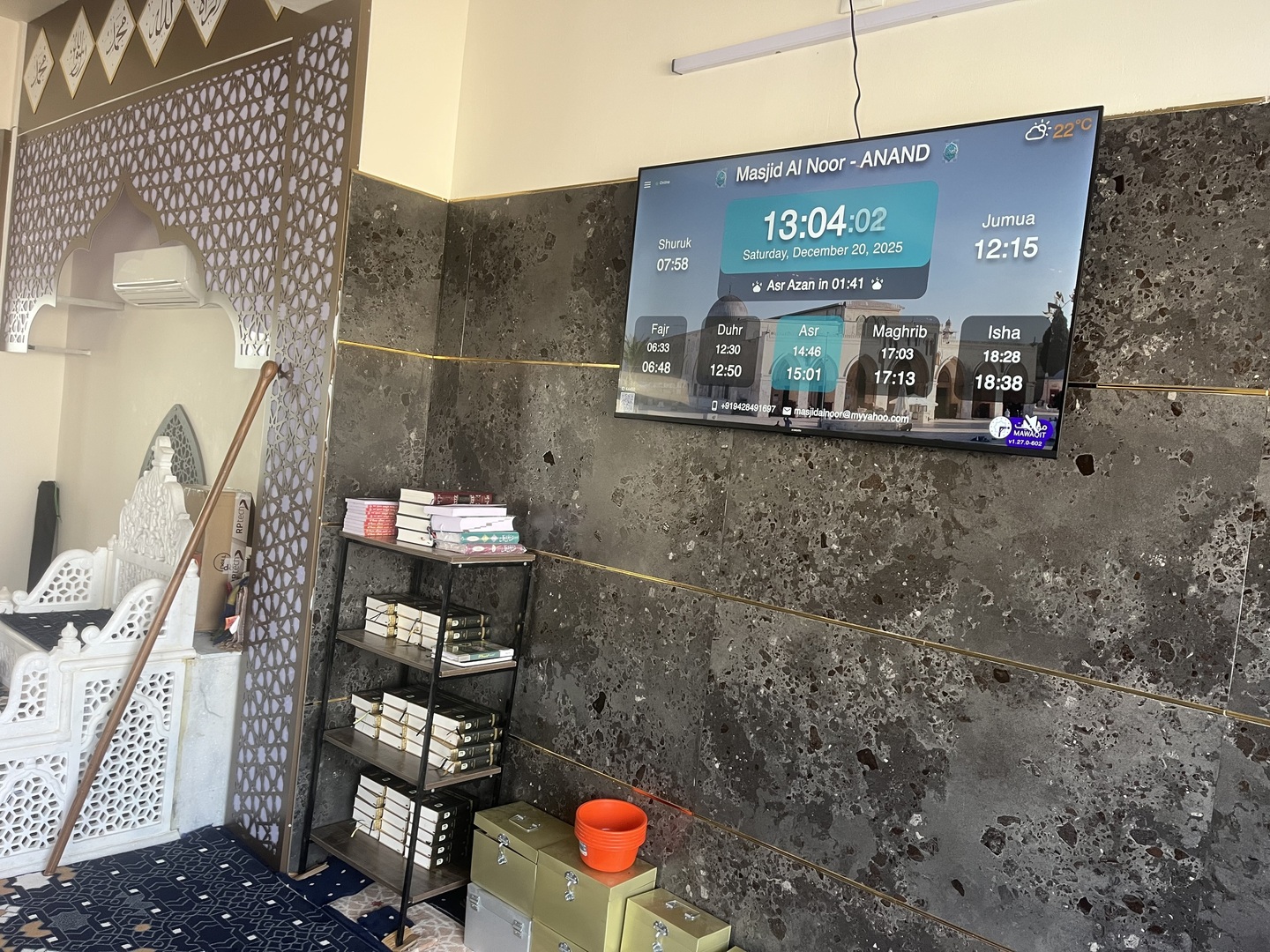 Entre l'adhan et iqama, et après chaque prière, des rappels et invocations sont affichés. Un hadith du prophète "que la prière d'Allah et son salut soient sur lui" est également affiché toutes les 5 min