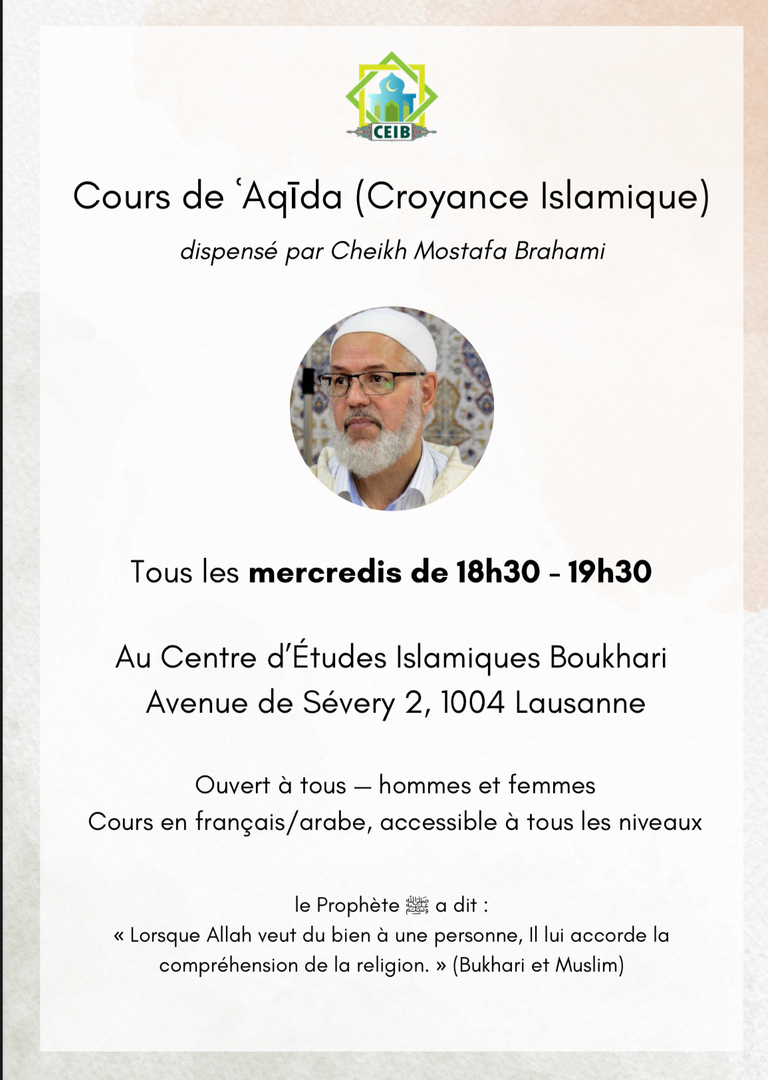 Le Cours de Aqida du Mercredi 5 novembre sera déplacé exceptionnellement au Samedi 8 novembre de 18h30-19h30