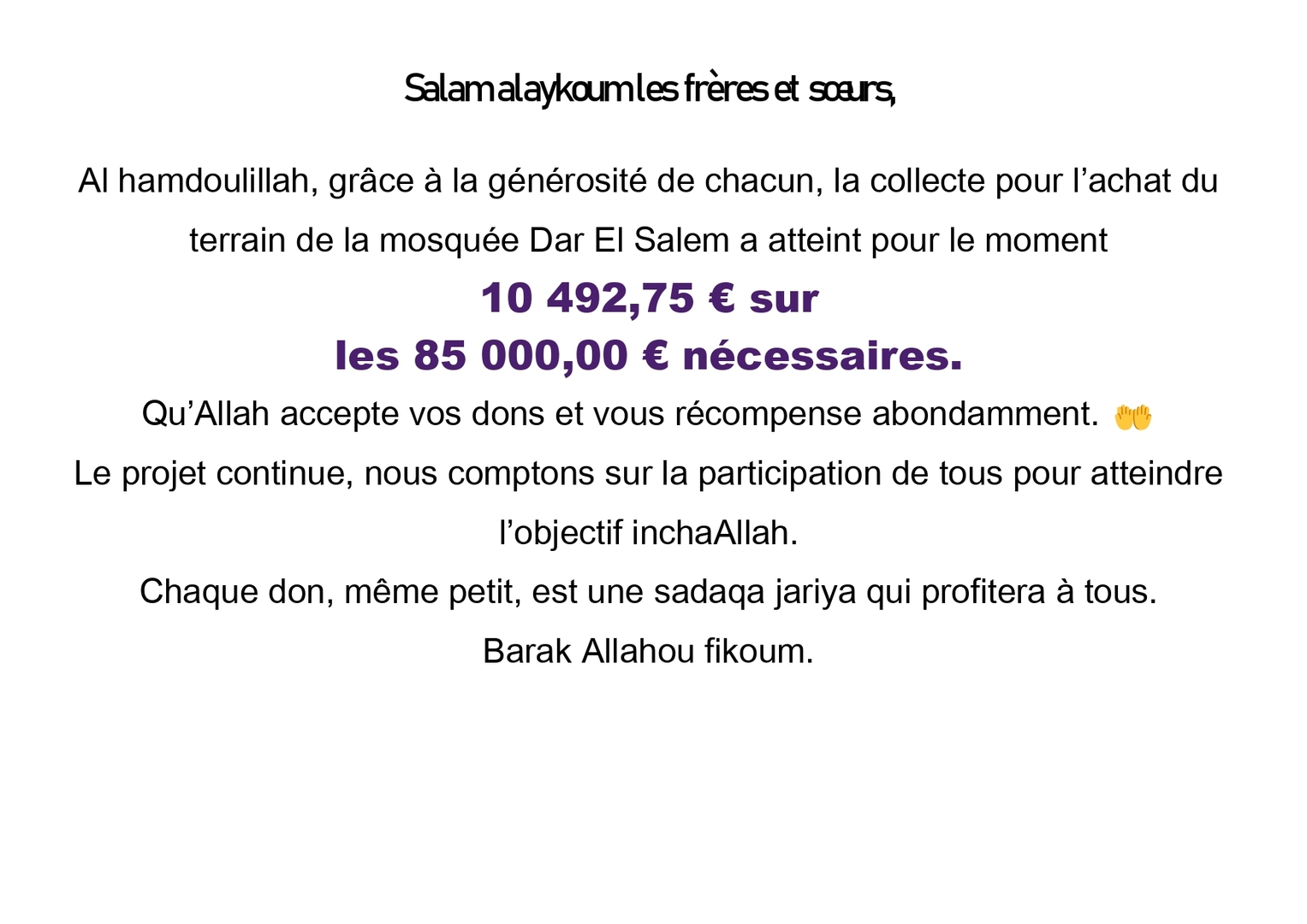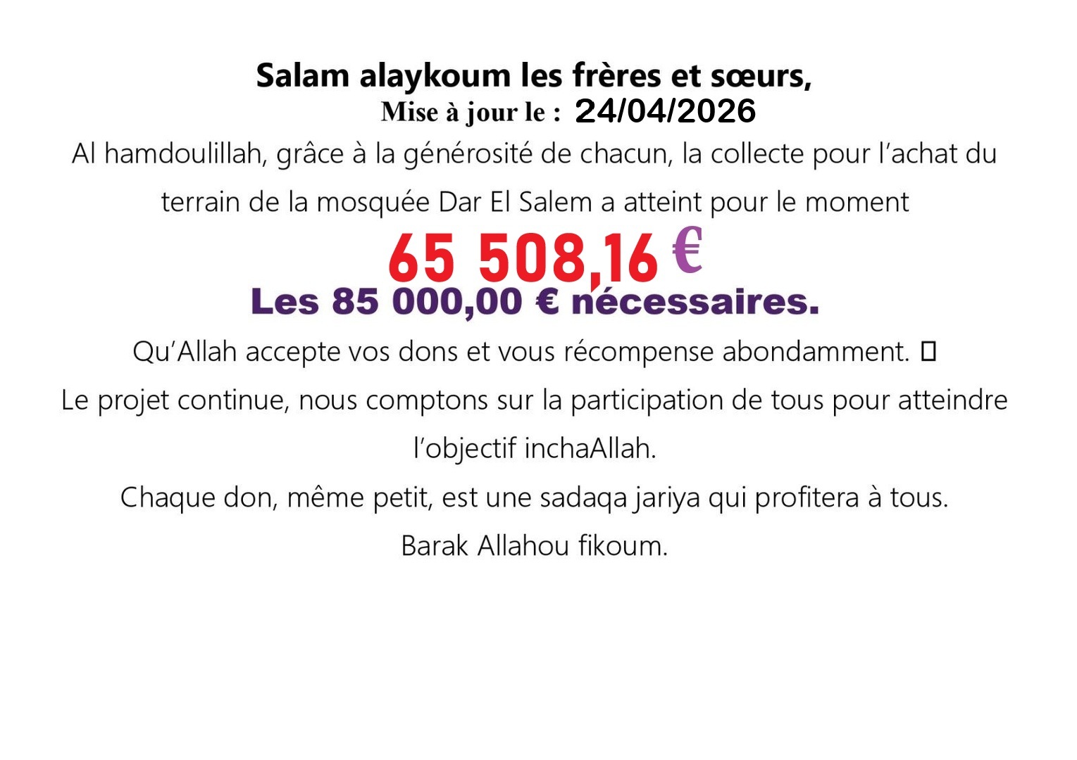 Notre association Dar El Salem lance une collecte pour l’acquisition d’un terrain de 1100 m² afin de développer notre mosquée et accueillir la communauté dans de meilleures conditions. https://www.helloasso.com/associations/dar-el-salem-de-la-solidarite/formulaires/1