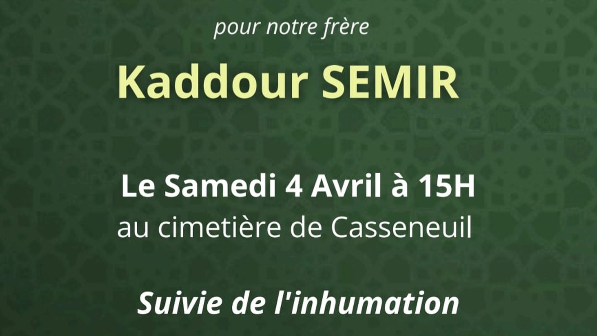 Nous vous informons qu'une sadaqa est organisée pour notre cher frère AHMED LOUALICHE Rahimo Allah le vendredi 10 avril après salâte 3icha à la mosquée de Sainte-Livrade-sur-Lot.