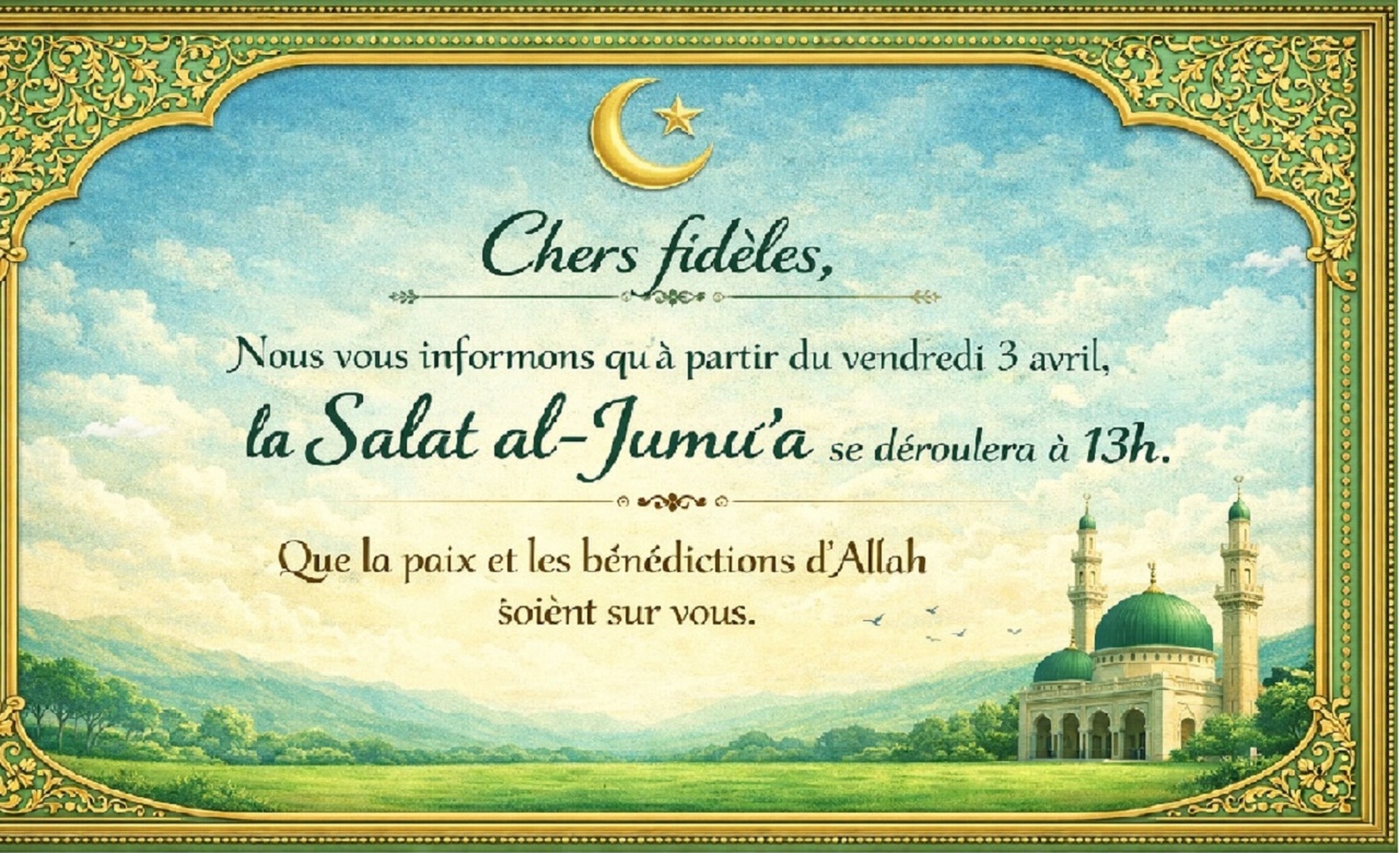 Chers fidèles, Nous vous informons qu'à partir du vendredi 3 avril, la Salat al-Jumu'a se déroulera à 13h. Que la paix et les bénédictions d'Allah soient sur vous.