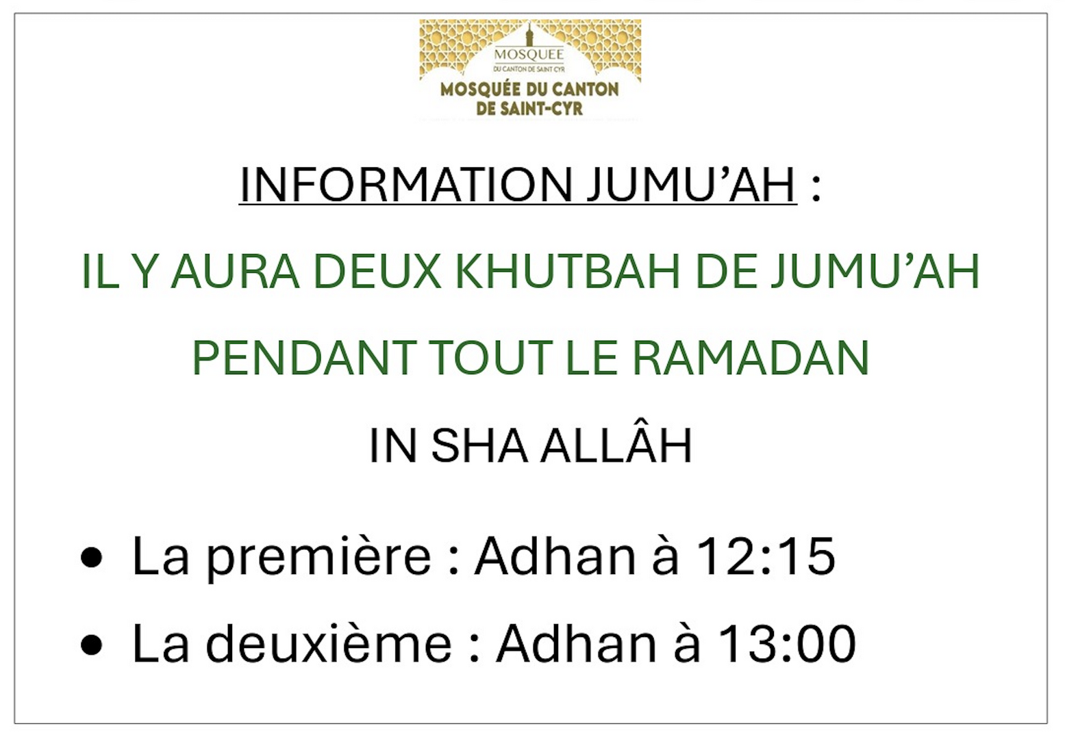 2 Khutbah pendant Ramadan: 12h15 & 13:00