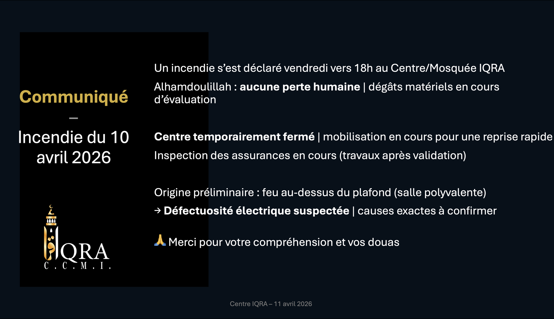 Communiqué - Incendie du 10 avril 2026