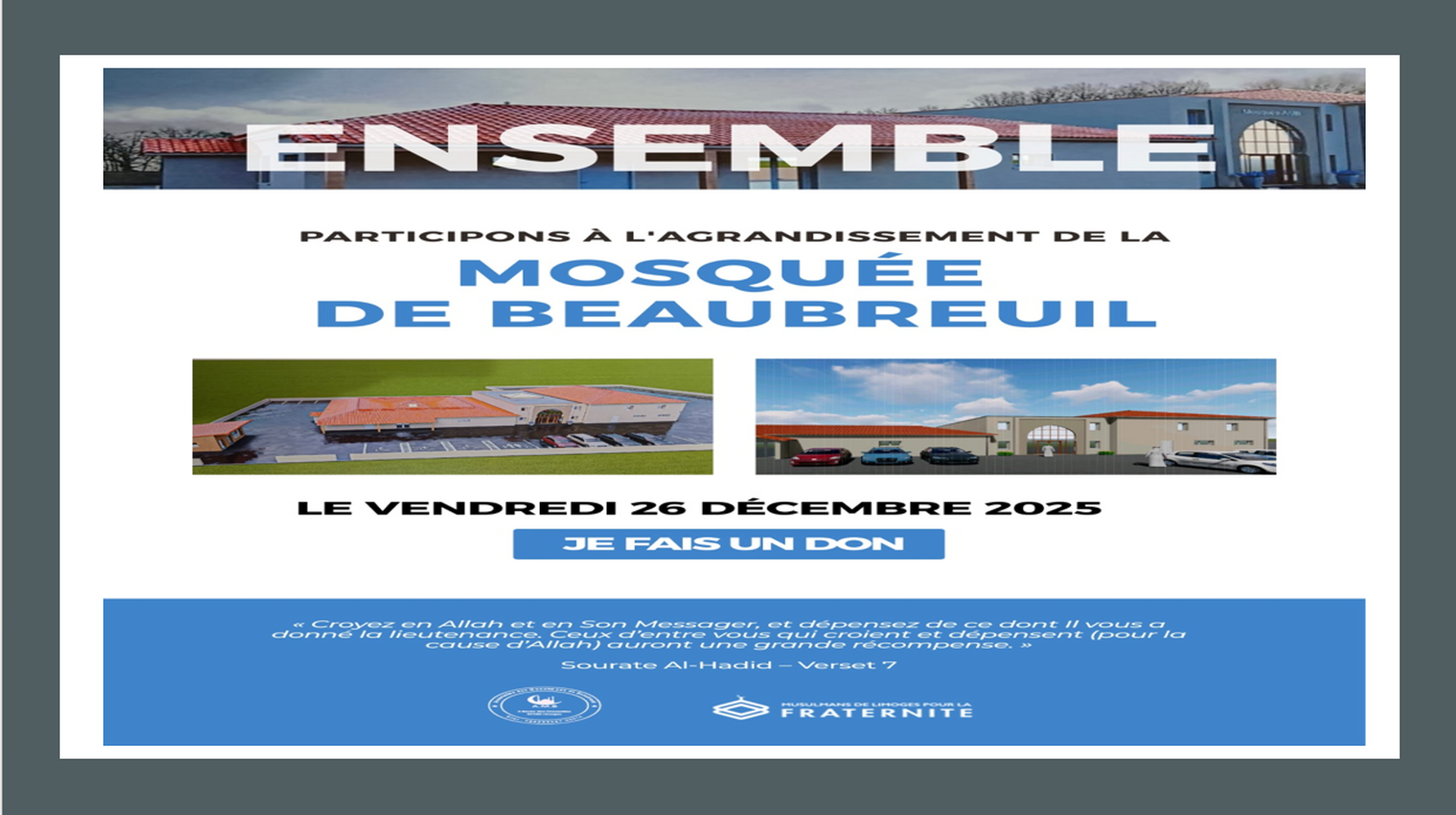 La Grande Mosquée de Limoges organise une collecte en soutien au projet d’agrandissement de la Mosquée de Beaubreuil, le vendredi 26 décembre 2025.