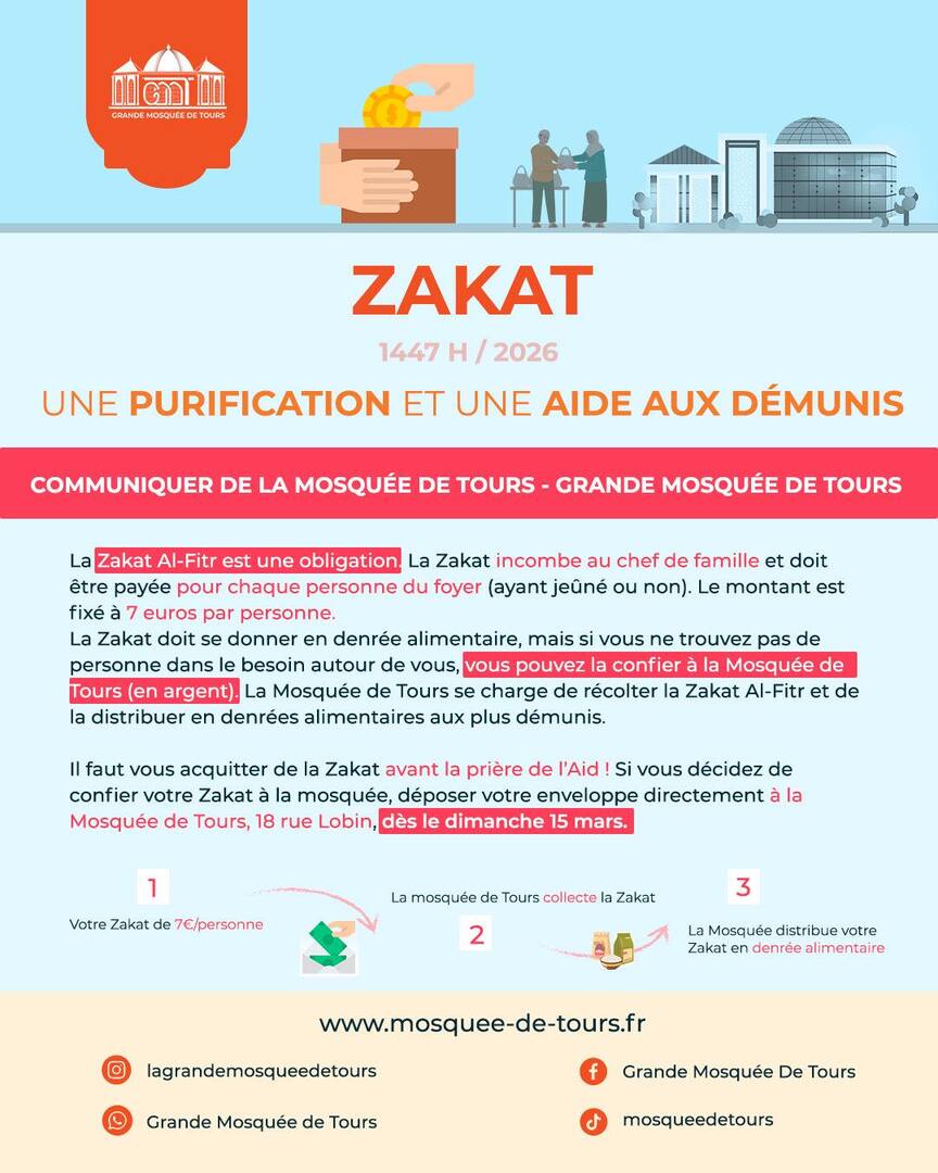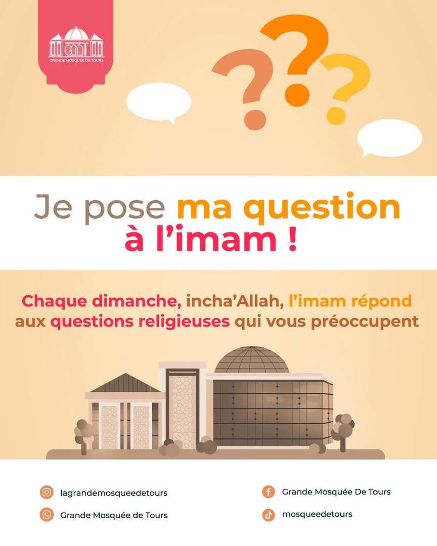 Suivez toute l'actualité de votre mosquée sur les Réseaux sociaux "@lagrandemosquéedetours" "https://www.facebook.com/profile.php?id=615838" et sur notre site internet https://www.mosquee-de-tours.fr/