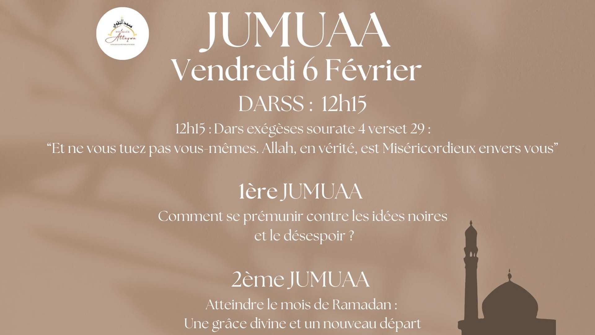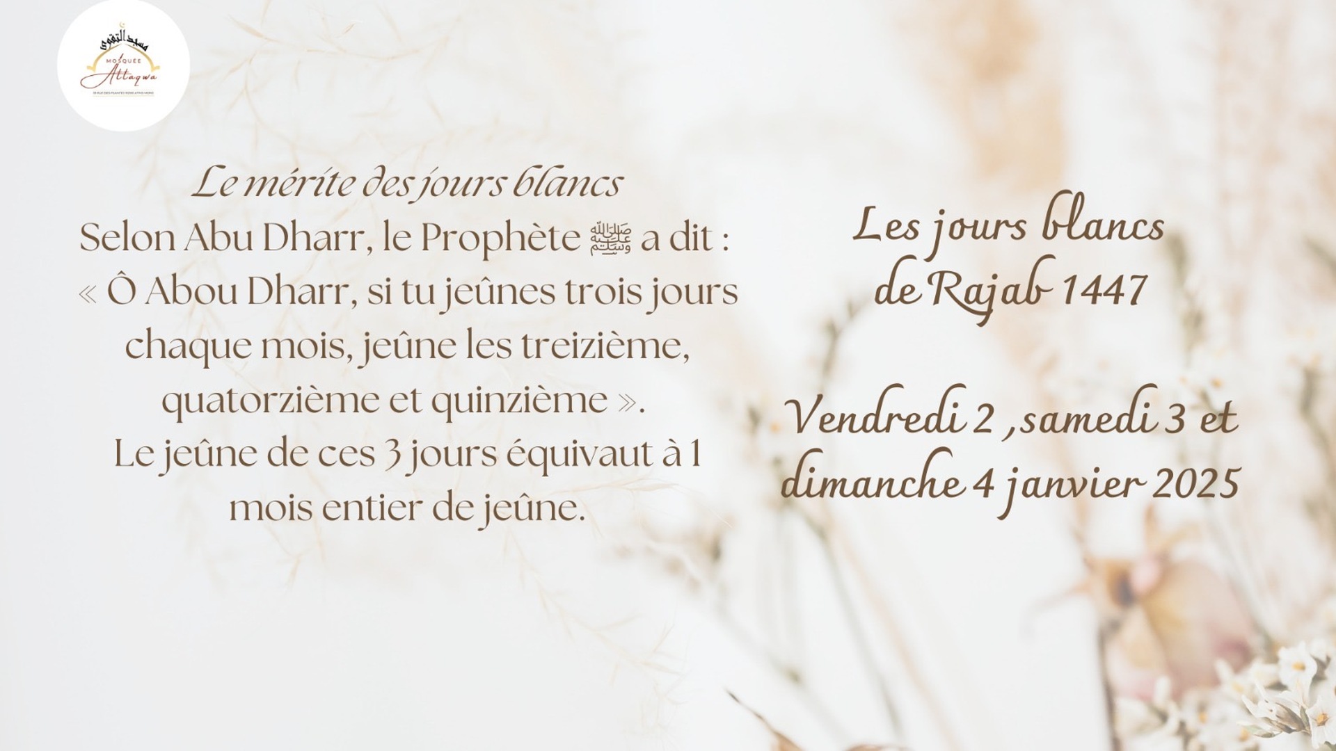 Ouverture de la mosquée : 30 minutes avant L’adhan et fermeture : 30 minutes après la prière.