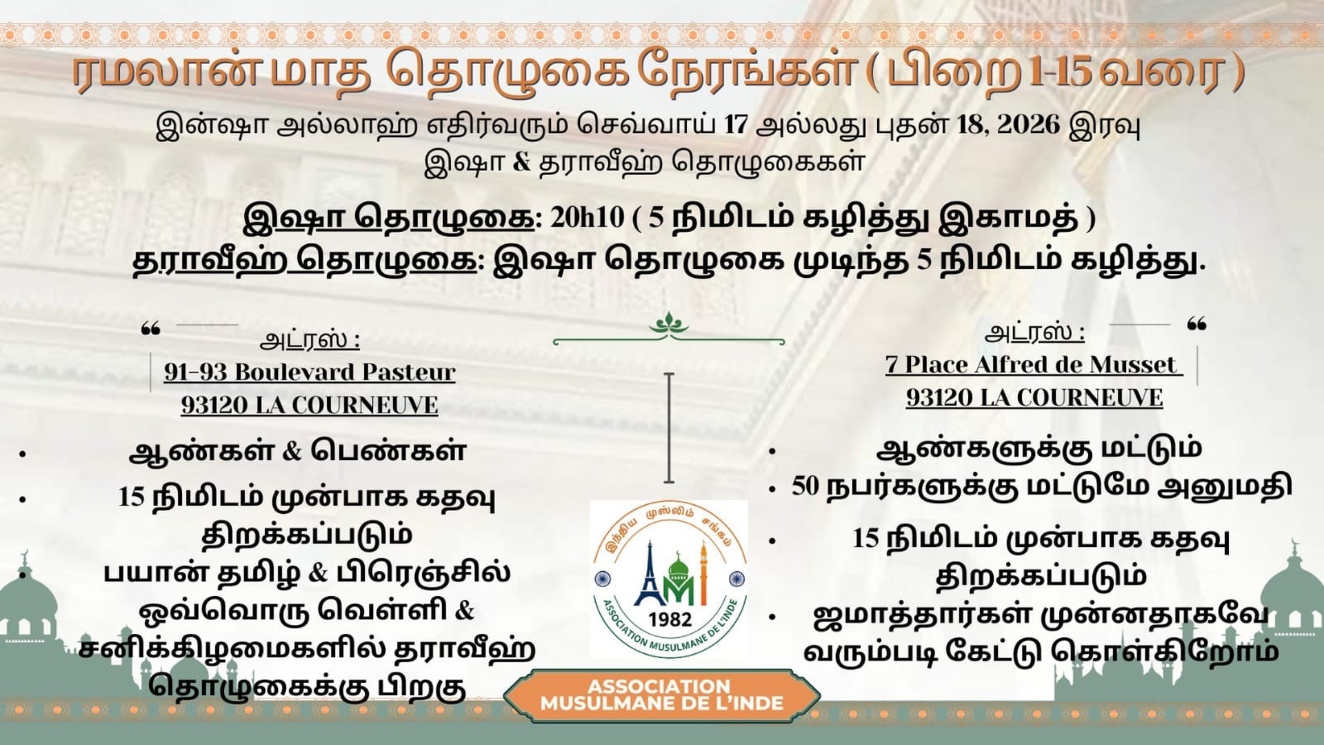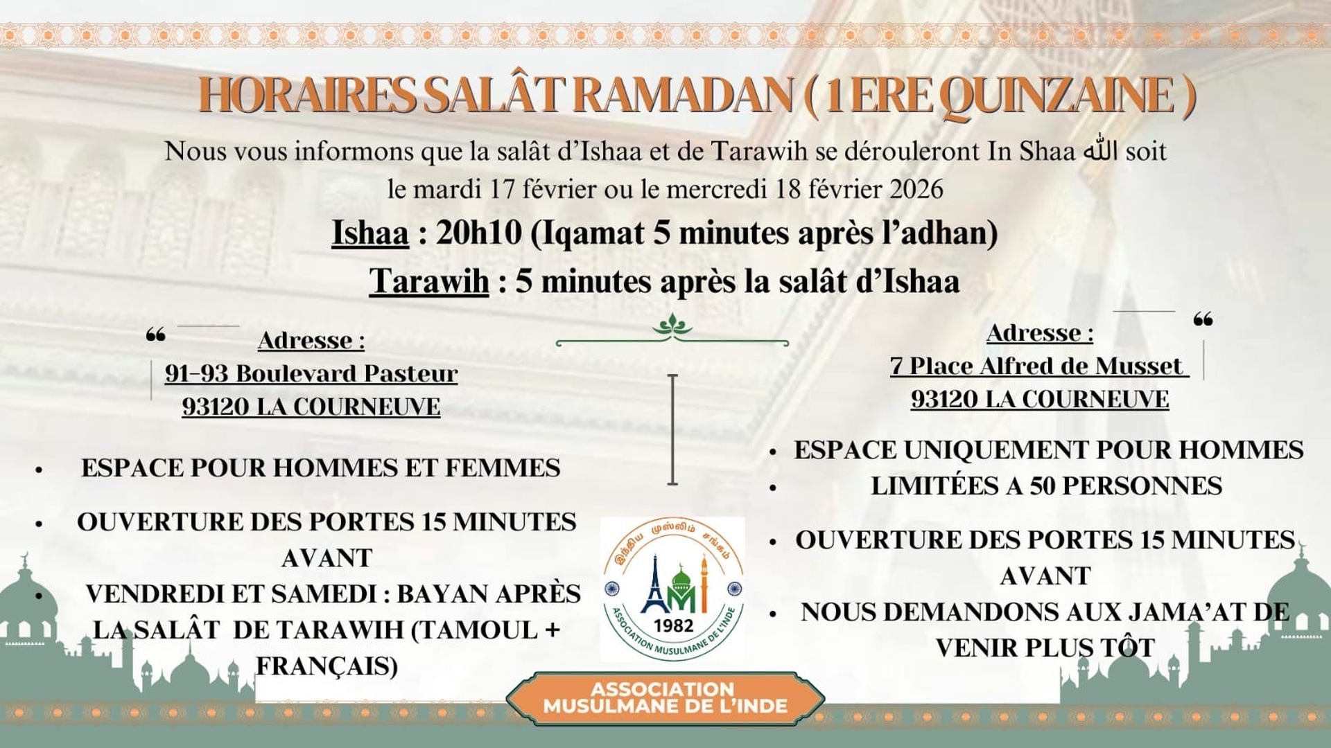 Chers fidèles, à partir du 26/10/25 nous vous informons qu'il y aura 2 Jumu’a au local situé à Boulevard Pasteur :